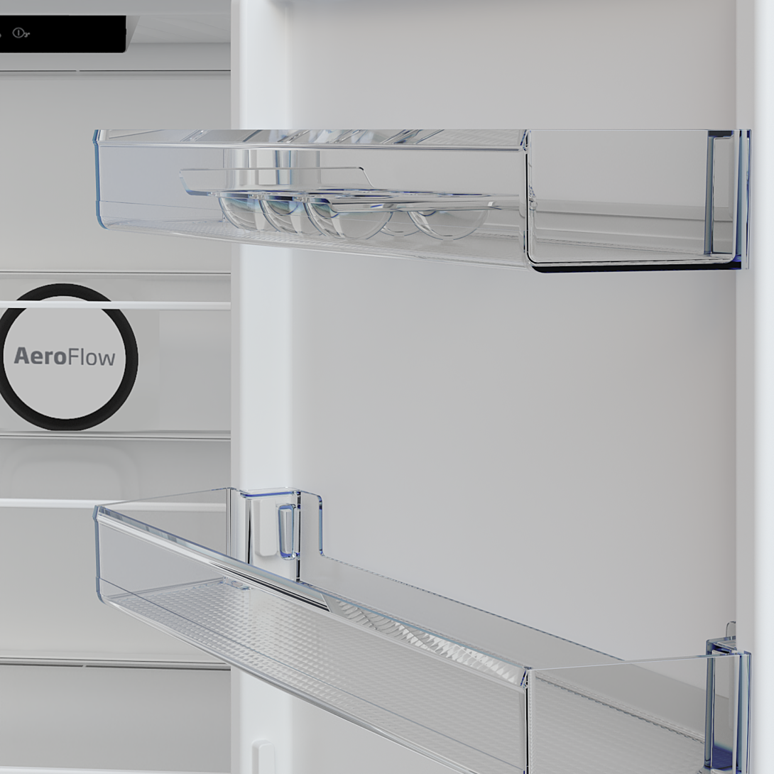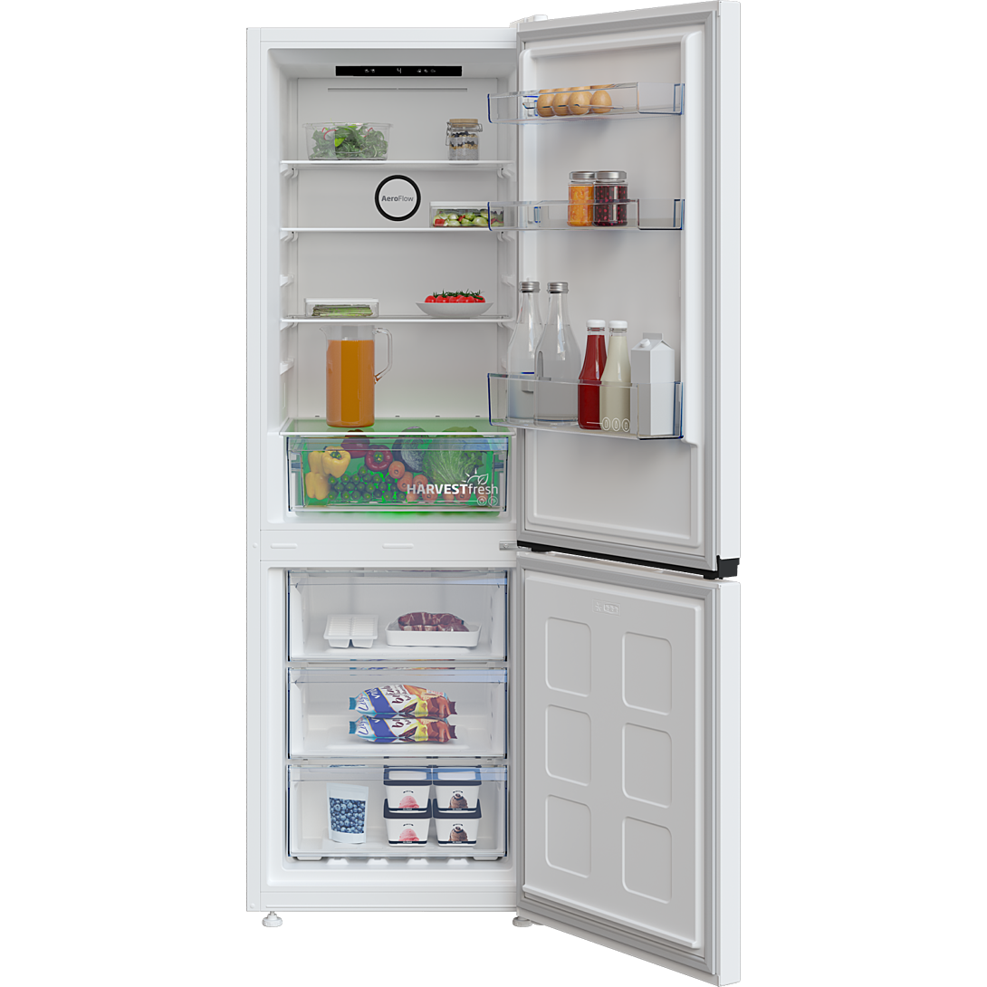 Réfrigérateur combiné pose-libre 301 L (209+92), AeroFlow, Technologie HarvestFresh, 4 clayettes en verre, 1 bac à légumes, congélateur 2 tiroirs, classe E, 37 db, alarme de porte ouverte, éclairage LED, portes réversibles, coloris gris acier