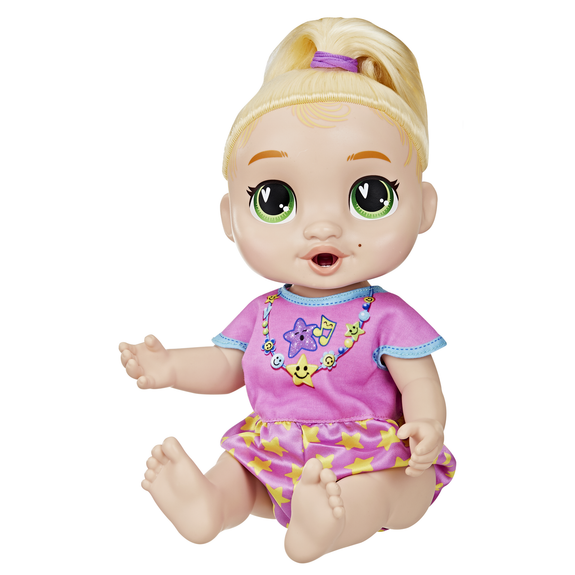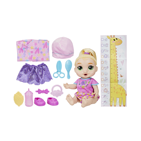 On peut révéler les moments importants de bébé avec la poupée interactive Bébé grandit LaLa GooGoo ! Cette poupée Baby Alive commence à l'étape nouveau-né, pendant laquelle on peut la bercer et lui donner son premier biberon. Elle grandit pour passer à l'étape bébé, pendant laquelle elle repousse sa couverture avec ses pieds ! On peut alors lui donner son biberon et sa tétine pour révéler sa première dent ! Puis on lui donne son premier goûter pour voir une bouchée « disparaître » quand on appuie la nourriture factice contre sa bouche. Lorsqu'on entend un tintement de cloche, le moment est venu d'aider LaLa GooGoo à se tenir debout et à devenir un tout-petit. On peut utiliser les accessoires de poupée pour l'habiller comme une grande fille pour la première fois avec les vêtements et les chaussures Baby Alive. On peut aussi se servir des ciseaux pour faire semblant de lui donner sa première coupe de cheveux. LaLa GooGoo prononcera également ses premiers mots, avec plus de 75 sons et phrases au total ! Quand les enfants ont terminé, il suffit d'éteindre et de rallumer la poupée pour rejouer et revivre toutes les étapes de la fiche de croissance. On découvre des moments magiques avec les accessoires, les coffrets et les poupées Baby Alice pour filles et garçons ! Baby Alive et toutes les marques associées sont des marques de commerce de Hasbro.