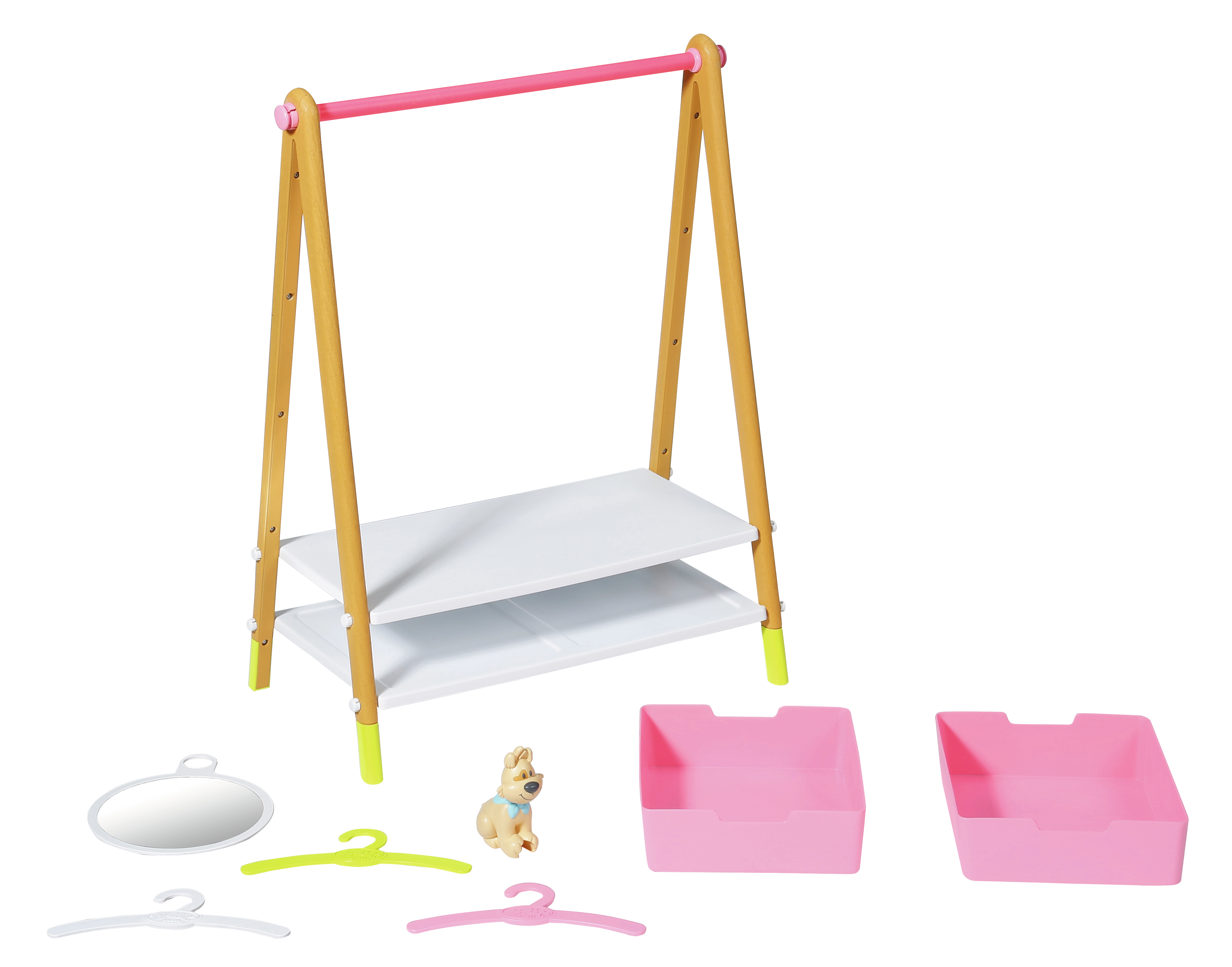 Penderie pour les beaux vêtements BABY born. Avec miroir détachable, 3 cintres, 2 bacs de rangement et le chien Bello pour la décoration