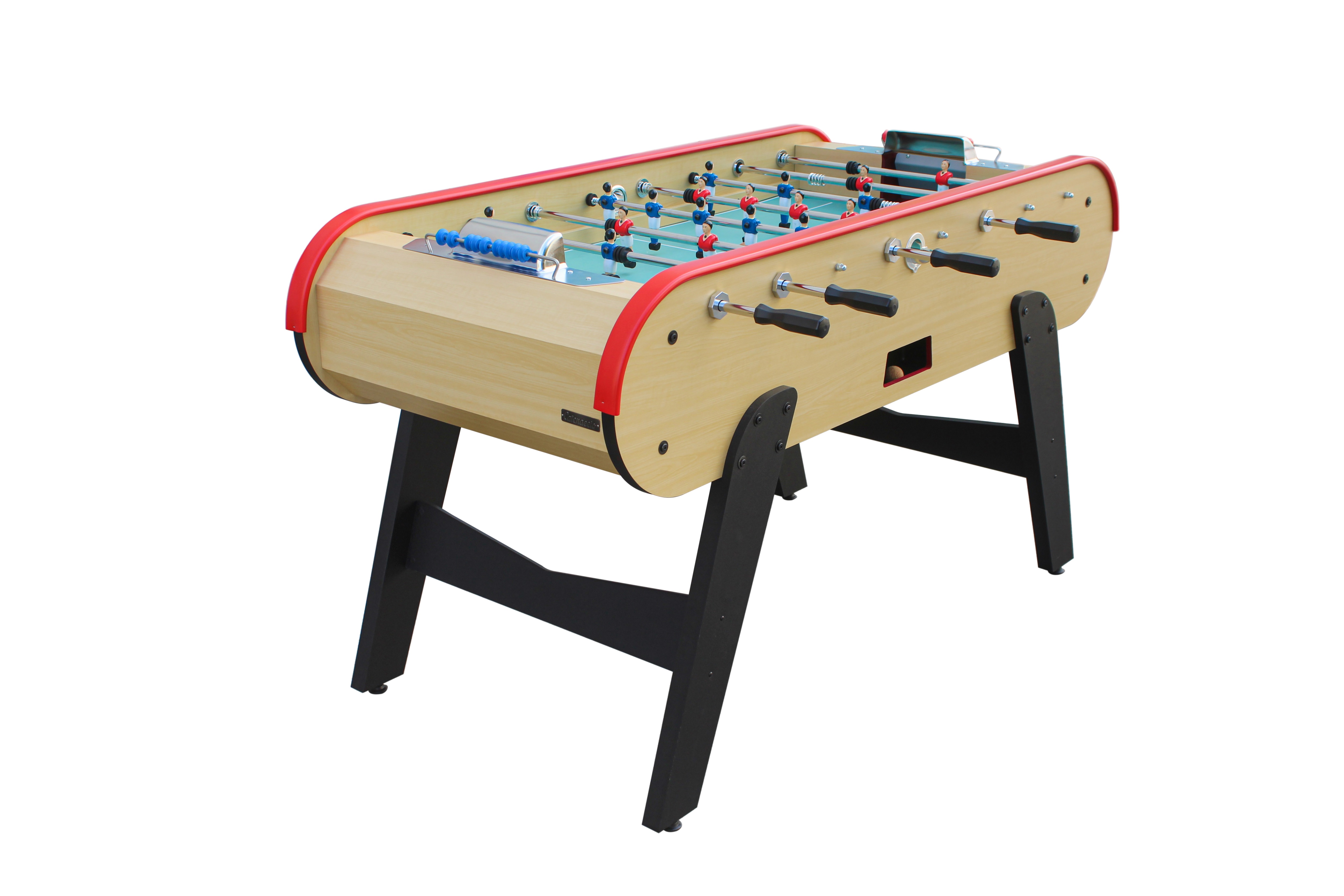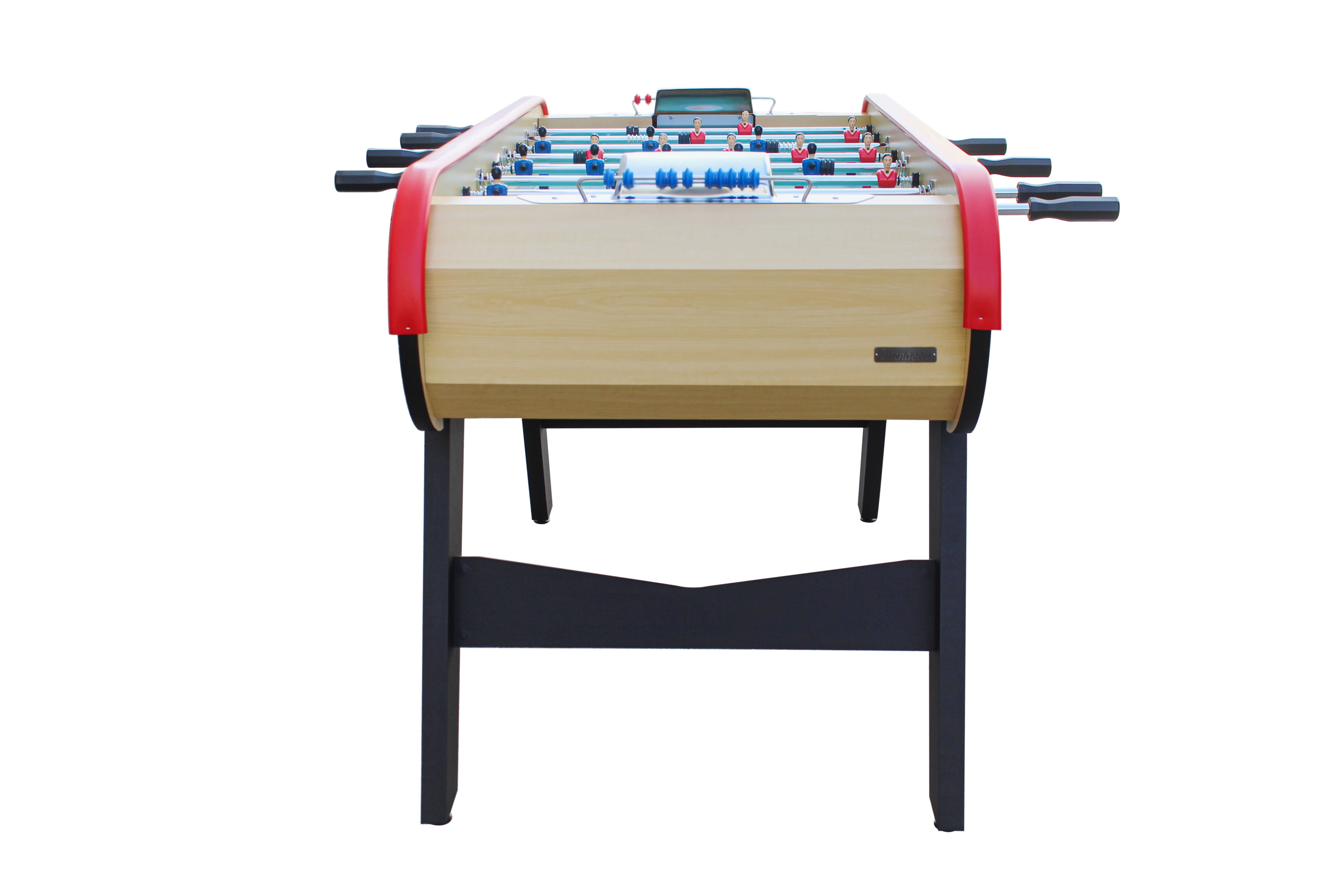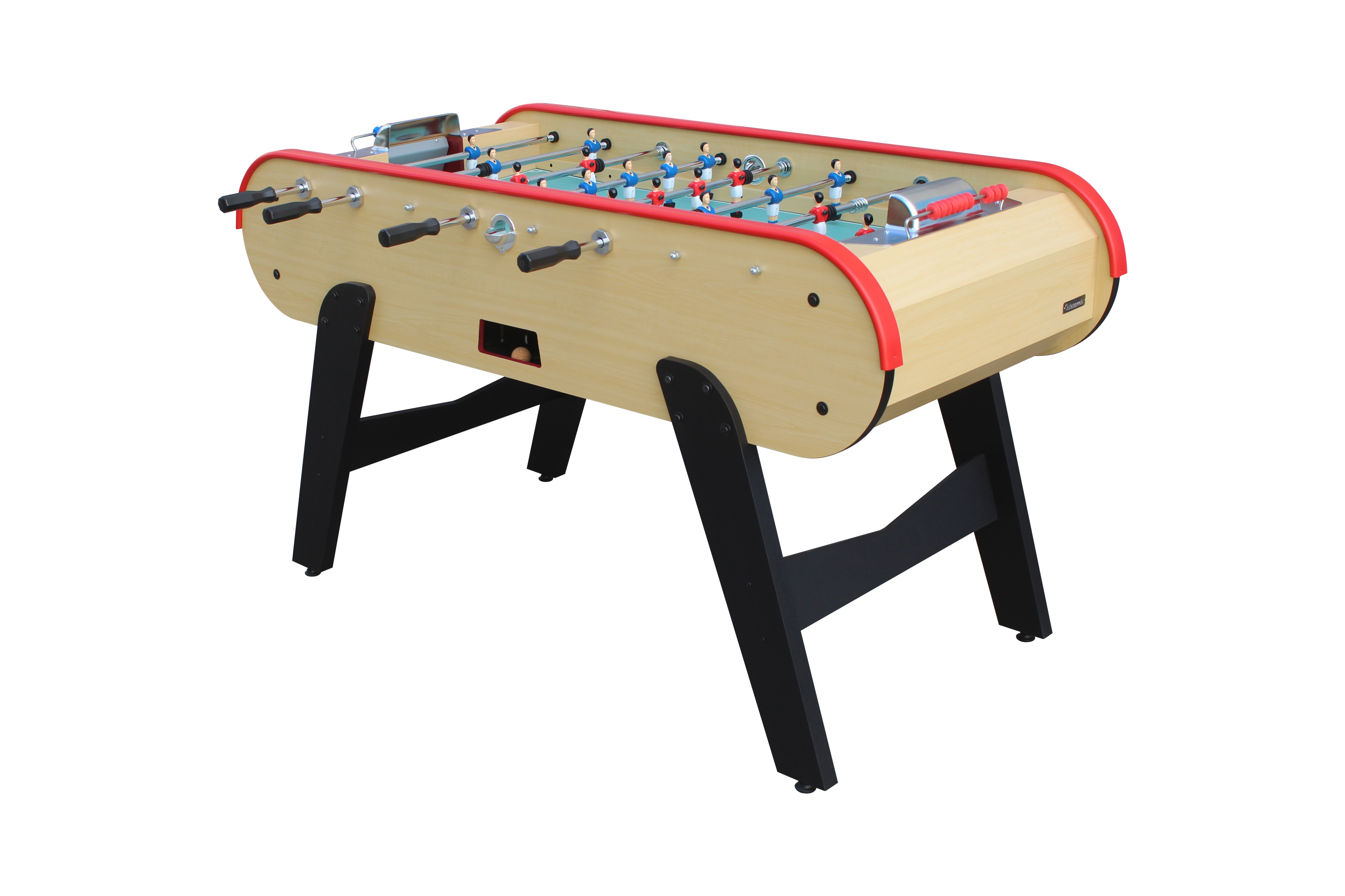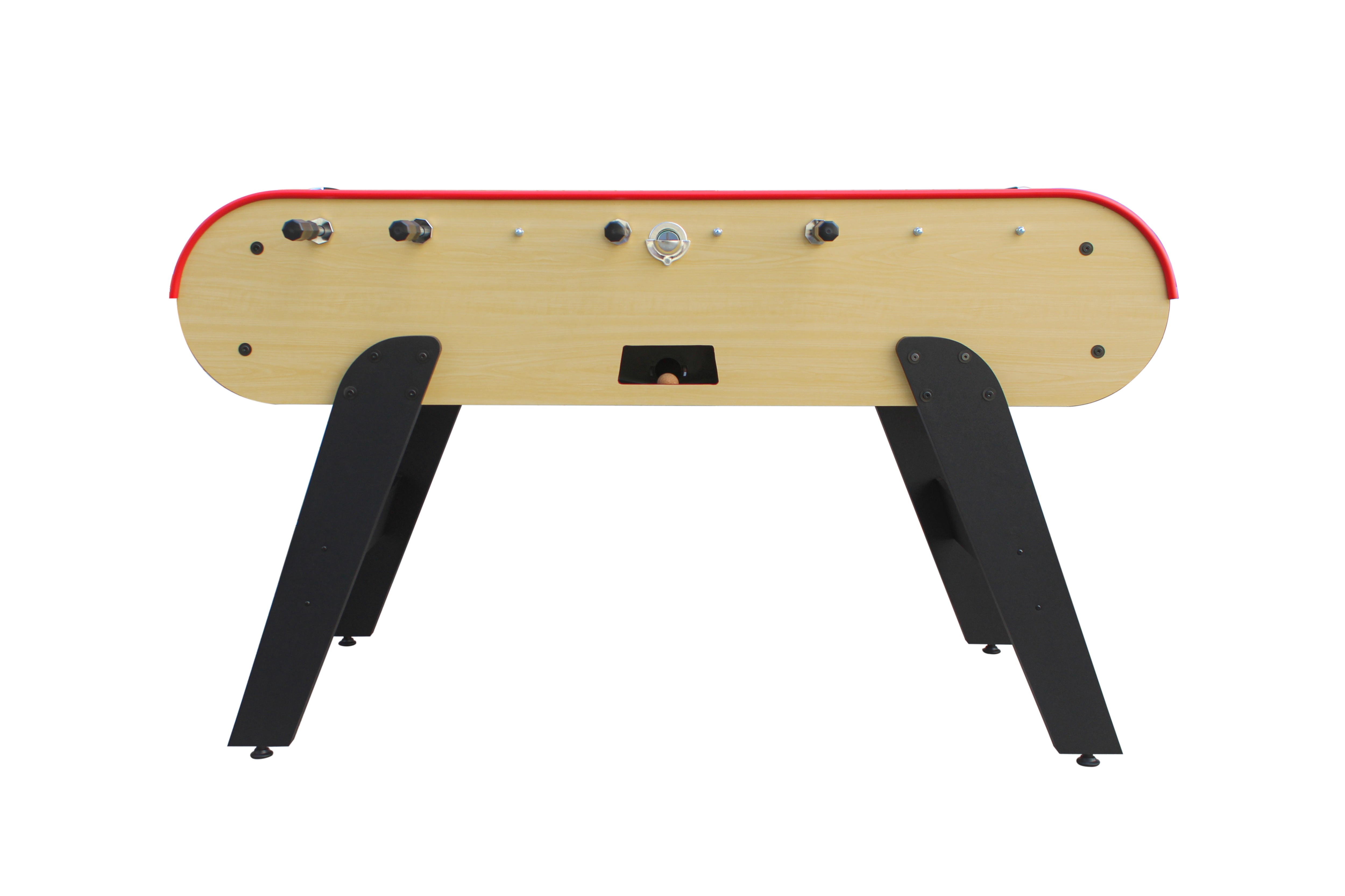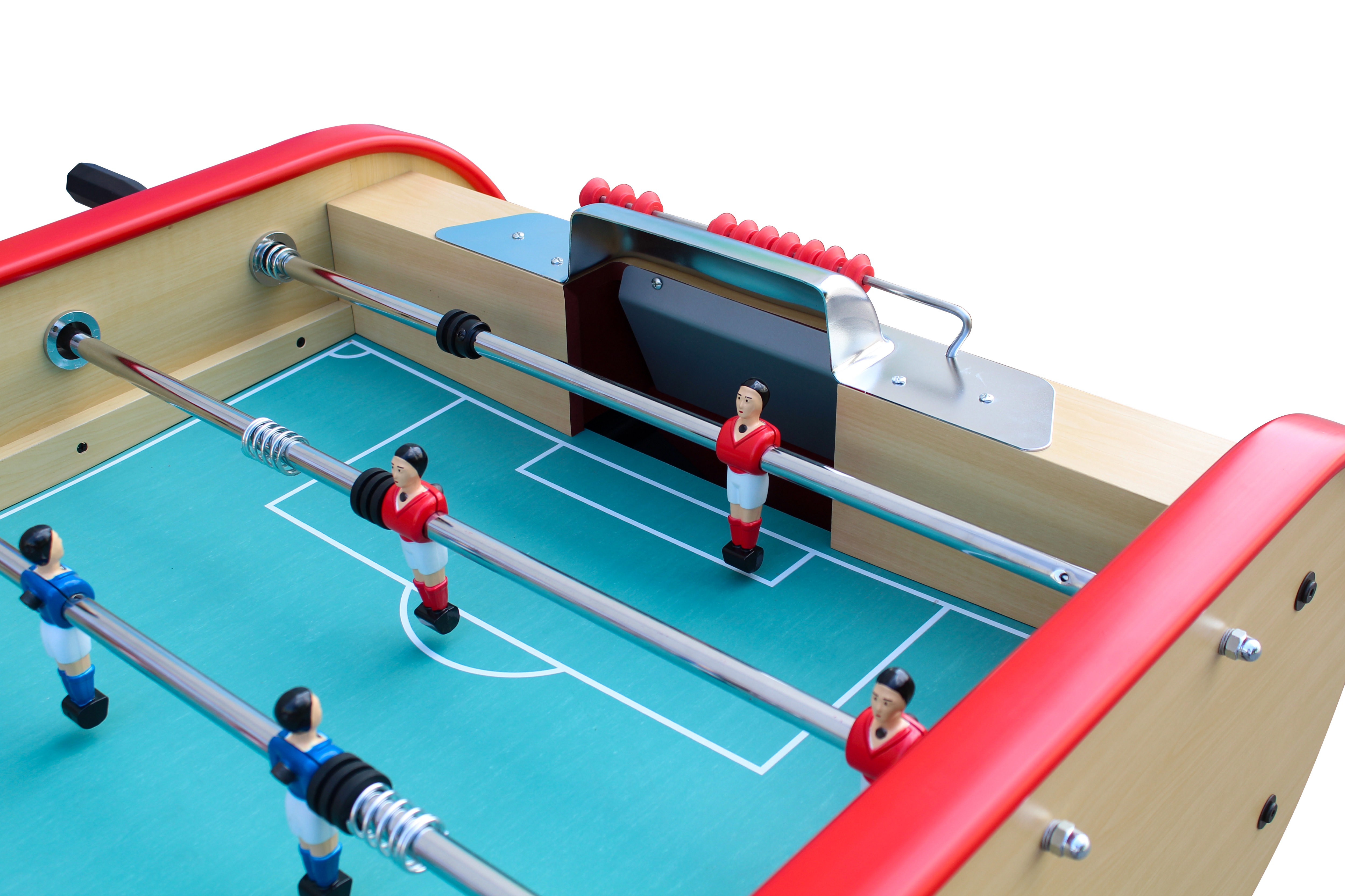 Voici le babyfoot idéal pour retrouver les sensations du babyfoot de bar! Les pieds alourdis et réglables permettent une très bonne stabilité. Le terrain est en Vinyl (type Gerflex) et vous permettra un contrôle précis de la balle dans toutes les situations. Les joueurs en aluminium et peints à la main couleur rouge et bleu sont fixés de la même manière que les babyfoots traditionnels, ce qui empêche qu’ils se dévissent ou s’usent prématurément comme sur de nombreuses autres tables. La descente de balle est restée centrale comme sur les modèles avec monnayeur et ce afin de garder le plaisir d'avoir les balles toutes rangées au même endroit ! Les barres de 15,8 mm de diamètre sont plus épaisses que la quasitotalité des barres sur le marché et sont en acier chromé avec amortisseurs en caoutchouc doublés de ressorts en métal pour un jeu fluide. Les coins du terrain sont évidemment relevés et le fond des cages est en métal afin que l’on puisse entendre le fameux bruit des tables de café sur chaque but marqué !