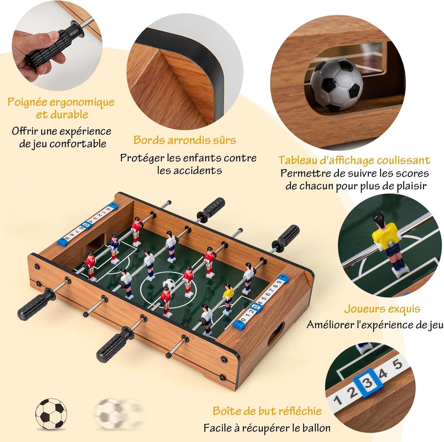 | Libellé | Baby-foot en bois avec poignée durable, table de jeu pour adulte et enfant avec 2 ballons, coins arrondis |