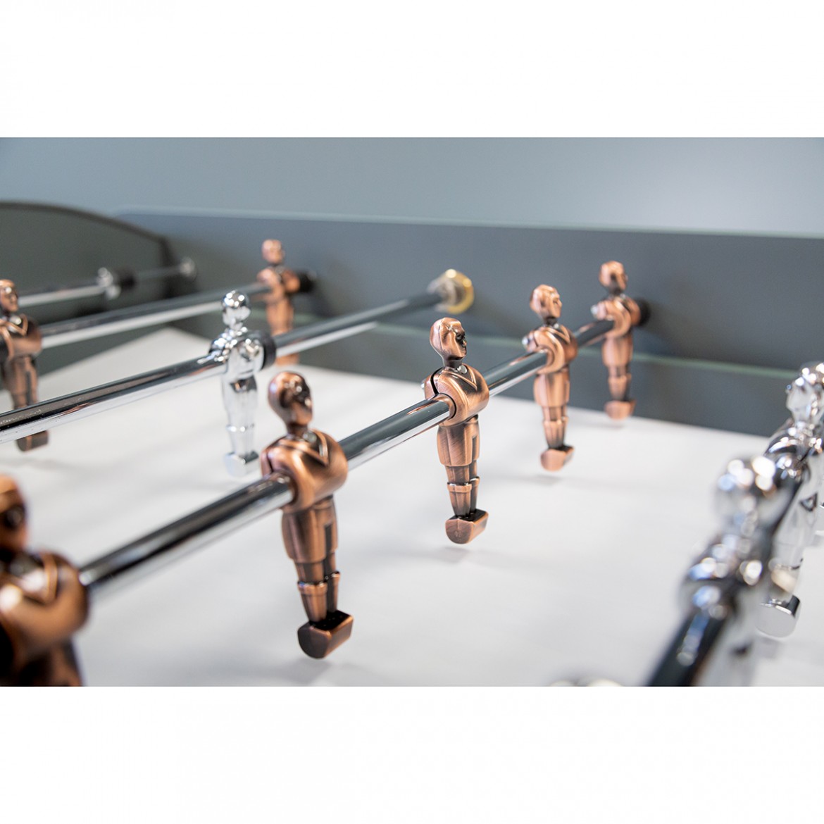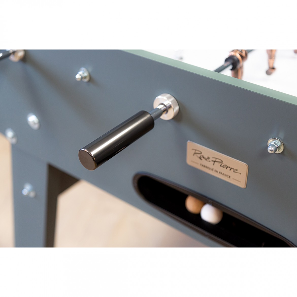 Ce magnifique baby-foot RENE PIERRE est plus qu'un authentique baby-foot de café, grâce à sa ligne et aux matériaux utilisés. La maison RENE PIERRE révolutionne le monde du baby-foot avec l'emploi des produits Fenix pour la fabrication de Onyx, qui en plus de leurs esthétiques exceptionnels sont également des matériaux high-tech, uniques par leurs caractéristiques et esthétique. Ce n'est pas un hasard si la maison RENE PIERRE a choisi les produits Fenix, fruit d'années de recherche dans la nanotechnologie, pour proposer un baby-foot au design magnifique qui allie qualité de jeu, aspect, touché incomparable, mais également une très haute résistance aux traces de doigts, ce qui est un atout majeur pour un meuble de cette qualité. Vous l'aurez compris, ce babyfoot est plus qu'un simple jeu, mais un meuble design qui répond aux exigences du Design d'intérieur : associer des matériaux intelligents et des surfaces mates. Baby-foot fabriqué avec le panneau révolutionnaire de marque ""Fenix"" (traitement anti-taches, super-mat, anti-rayures). Pieds avec traverses de renfort. Joueurs en métal vissés sur les barres télescopique en acier chromé Ø 14 mm. Paliers de glisse en laiton avec amortisseurs en acier trempé. Surface de jeu Gerflex blanc avec corners intégrés. Double compteur de points. Retour central des balles. Poignées en aluminium ""Snake"". Livré avec deux balles en liège blanches.