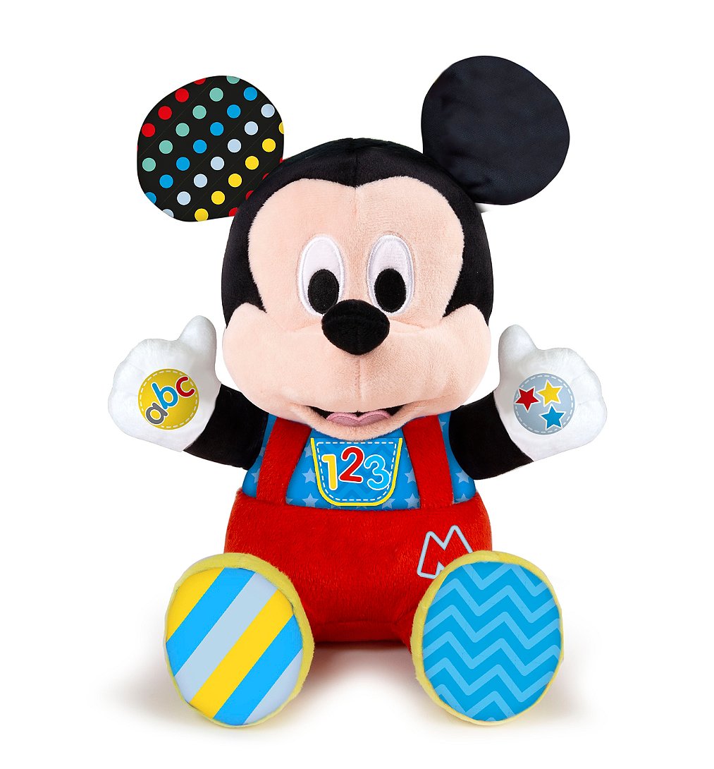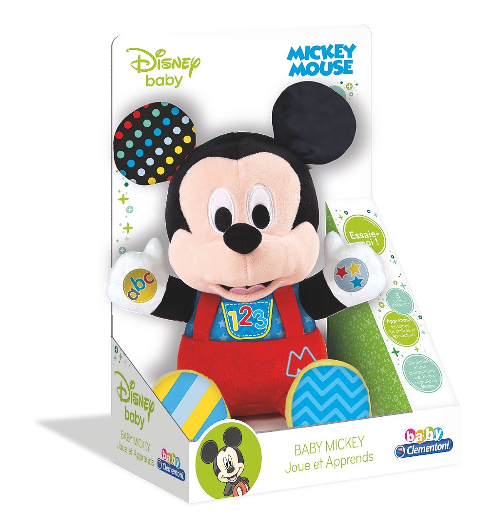 Cette adorable peluche toute douce va devenir la meilleure amie de votre enfant ! En appuyant sur ses 3 boutons sur ses mains et son ventre, Baby Mickey jouera de jolies mélodies. Bébé découvrira les premières lettres, les nombres et les couleurs en compagnie de Baby Mickey.Dimensions:37 x 26 x 14 cm