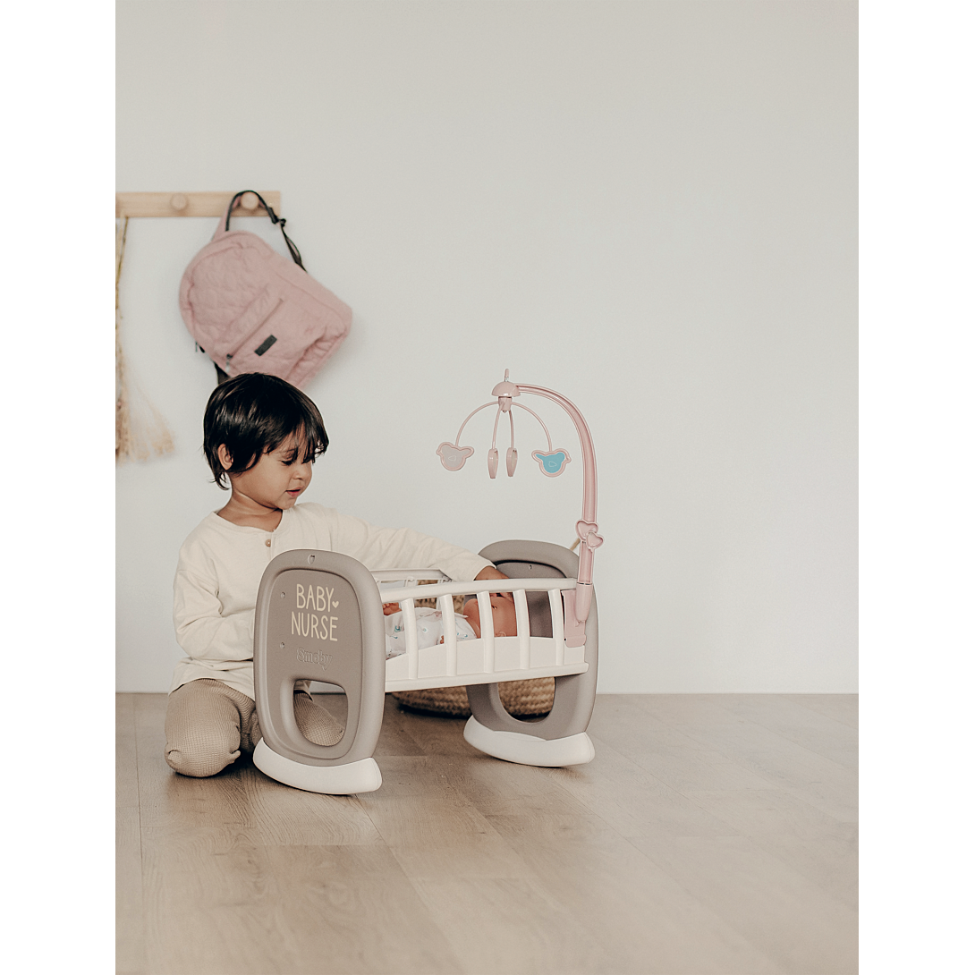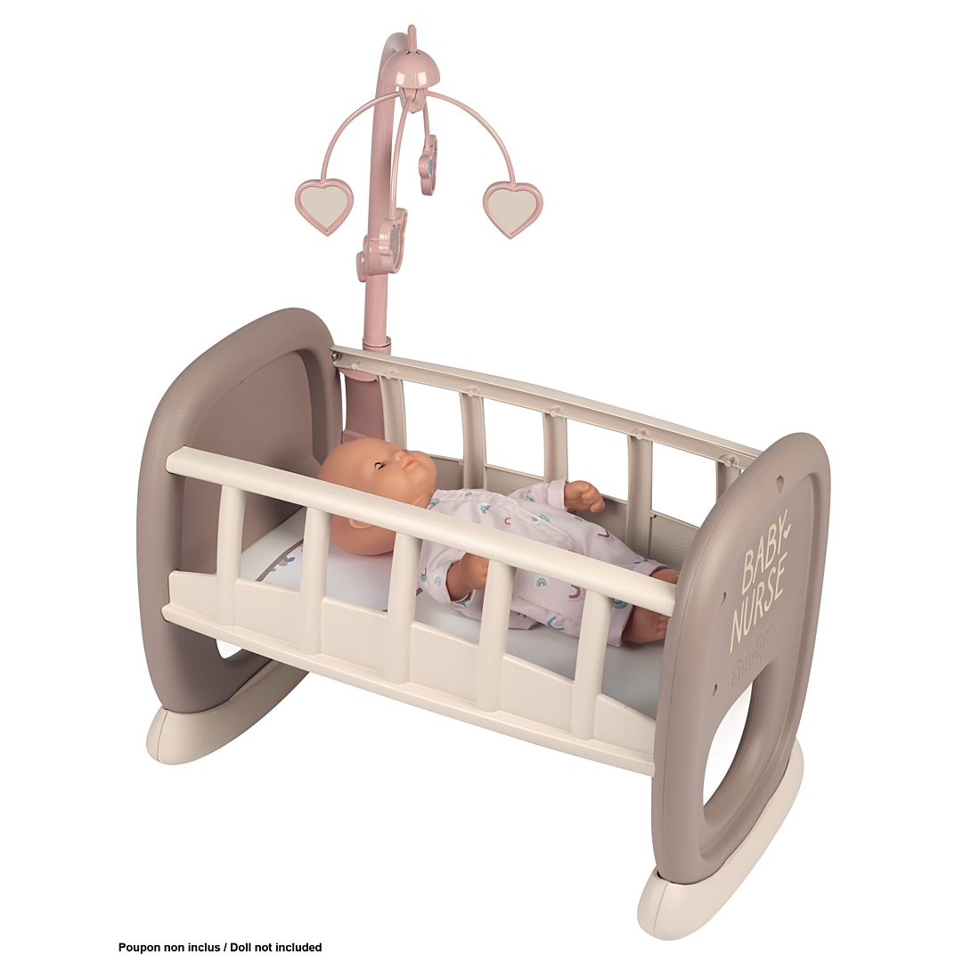 Lit à barreaux avec bascule Baby Nurse pour poupon jusqu'à 42cm. Les coques en plastique qui s'emboitent sur les pieds permettent de bercer facilement le poupon. 1 mobile à tourner manuellement inclus. Poupon non inclus. Fabrication française.