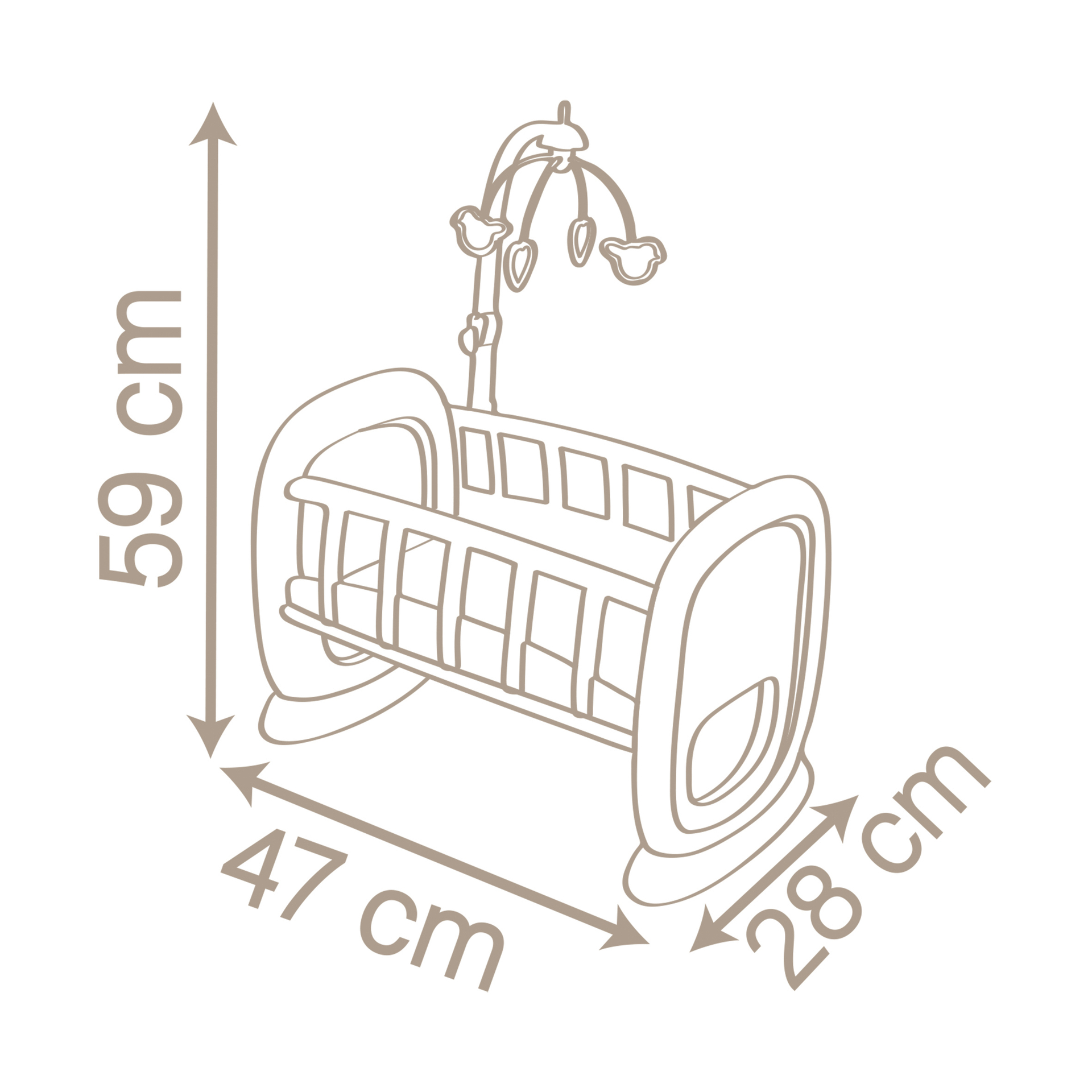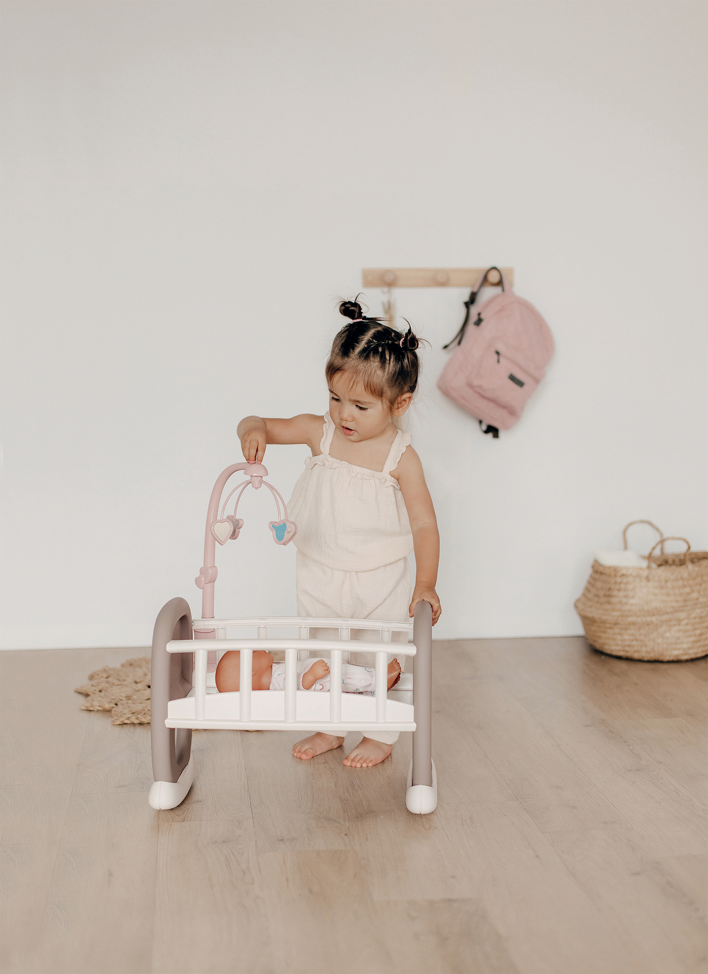 Plus produit Lit à barreaux avec système de bascule. Pour poupon jusqu\'à 42cm. 1 mobile à tourner manuellement. Poupon non inclus.