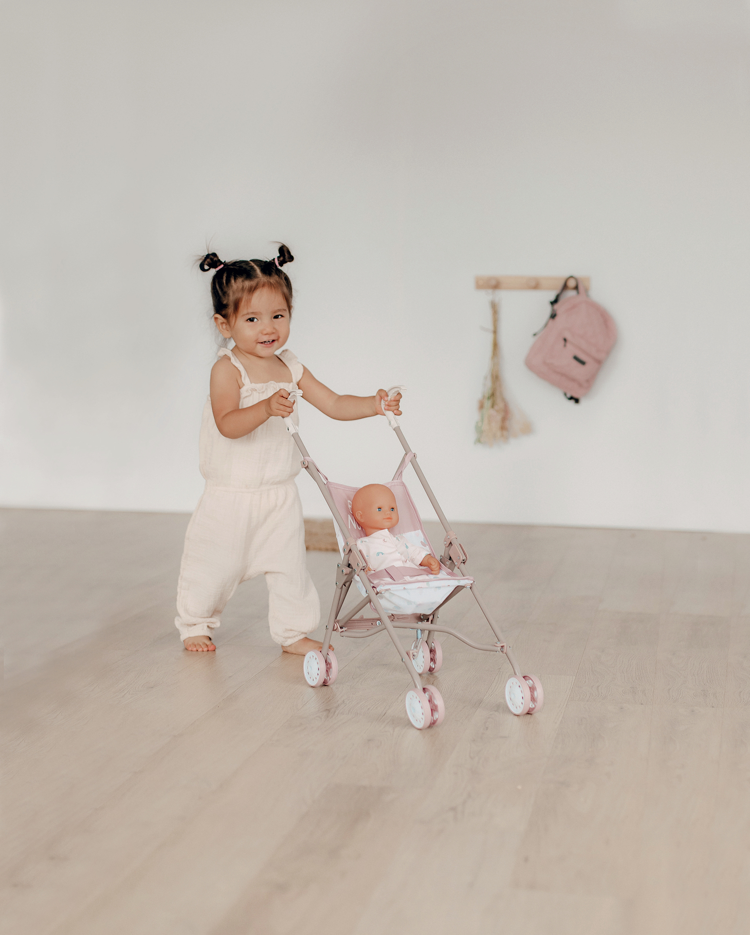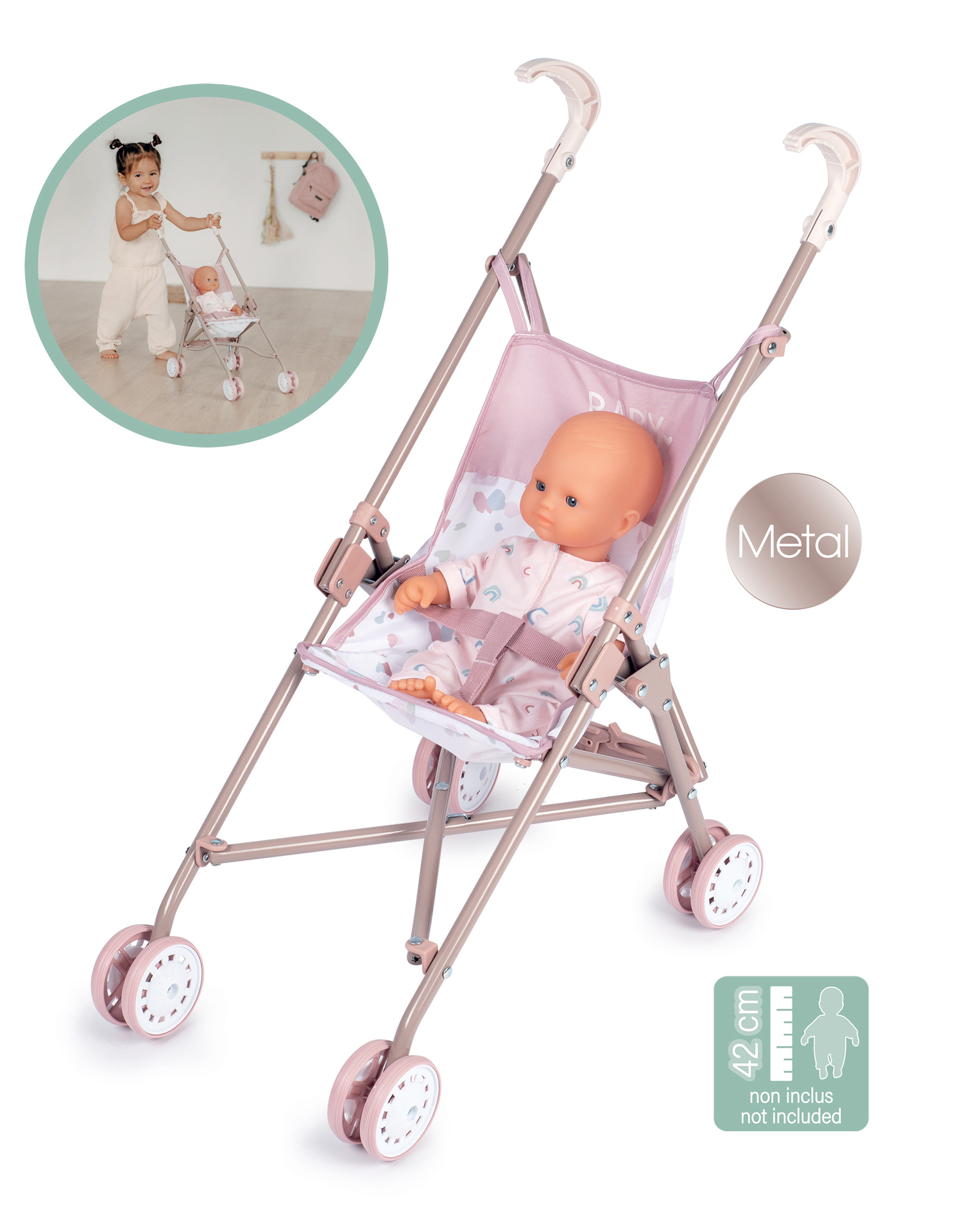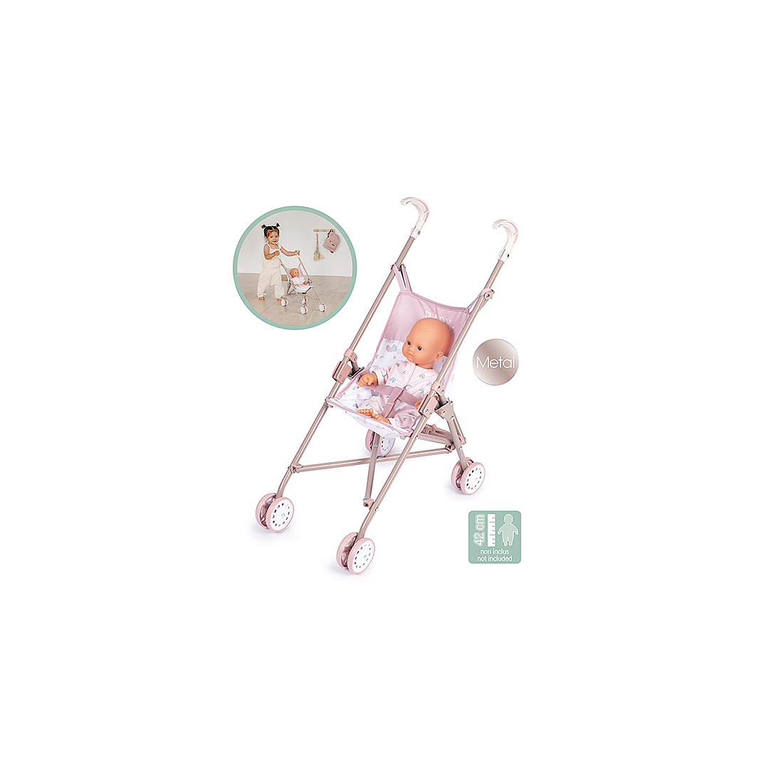 | Plus produit | Poussette pour poupon jusqu\'à 42cm. Structure en métal. Hauteur des poignées : 57cm. Pliable. Tissu déhoussable et lavable. Poupon non inclus. |