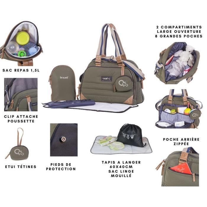 organisé autour de 2 vastes compartiments, large ouverture zippée, 8 poches, tapis a langer, sac REPAS 1,5L avec poignée pressionnée,étui tétines, clips poussette, bandouliere réglable , matiere ouatinée déperlante, détails effet cuir