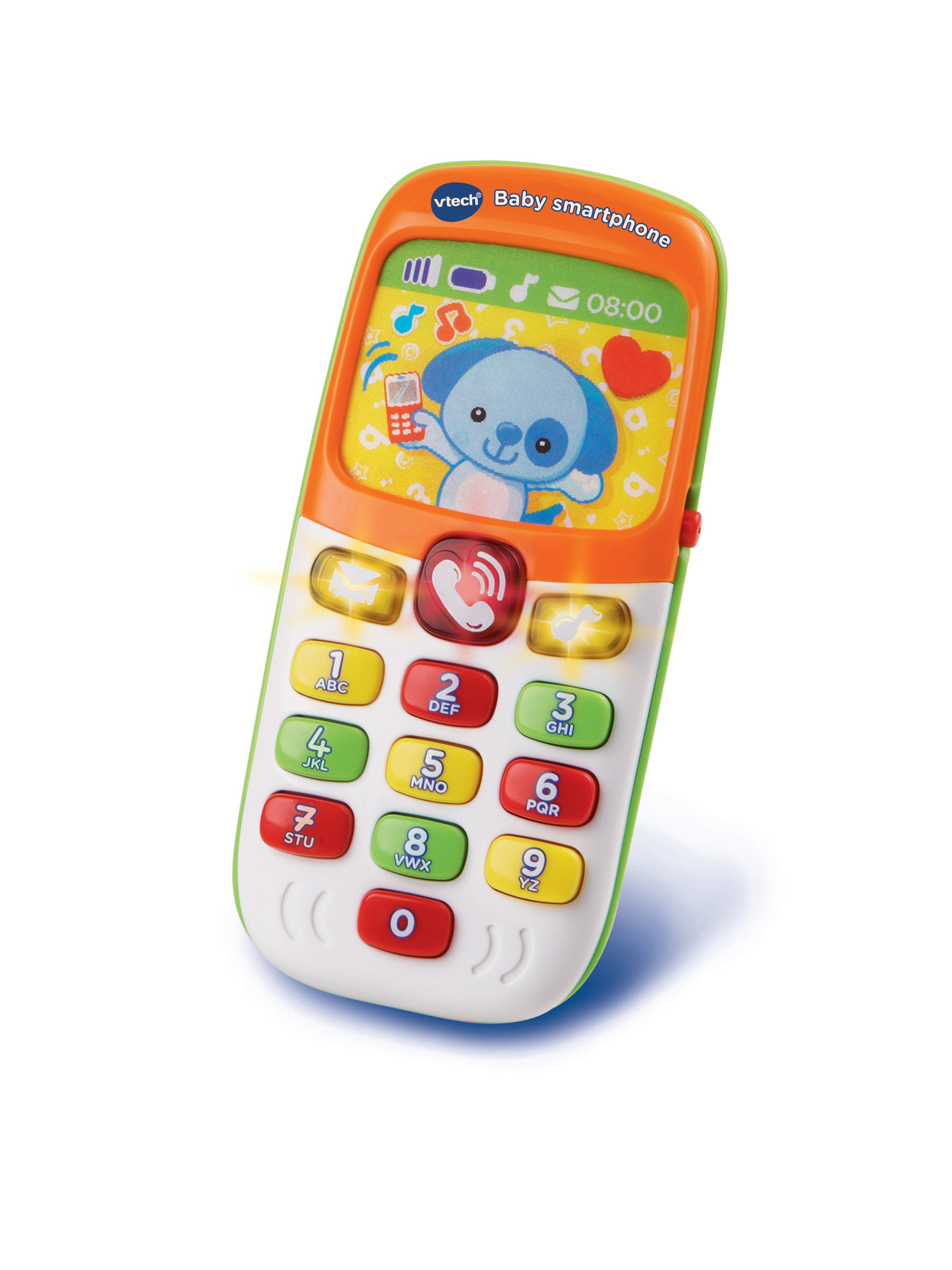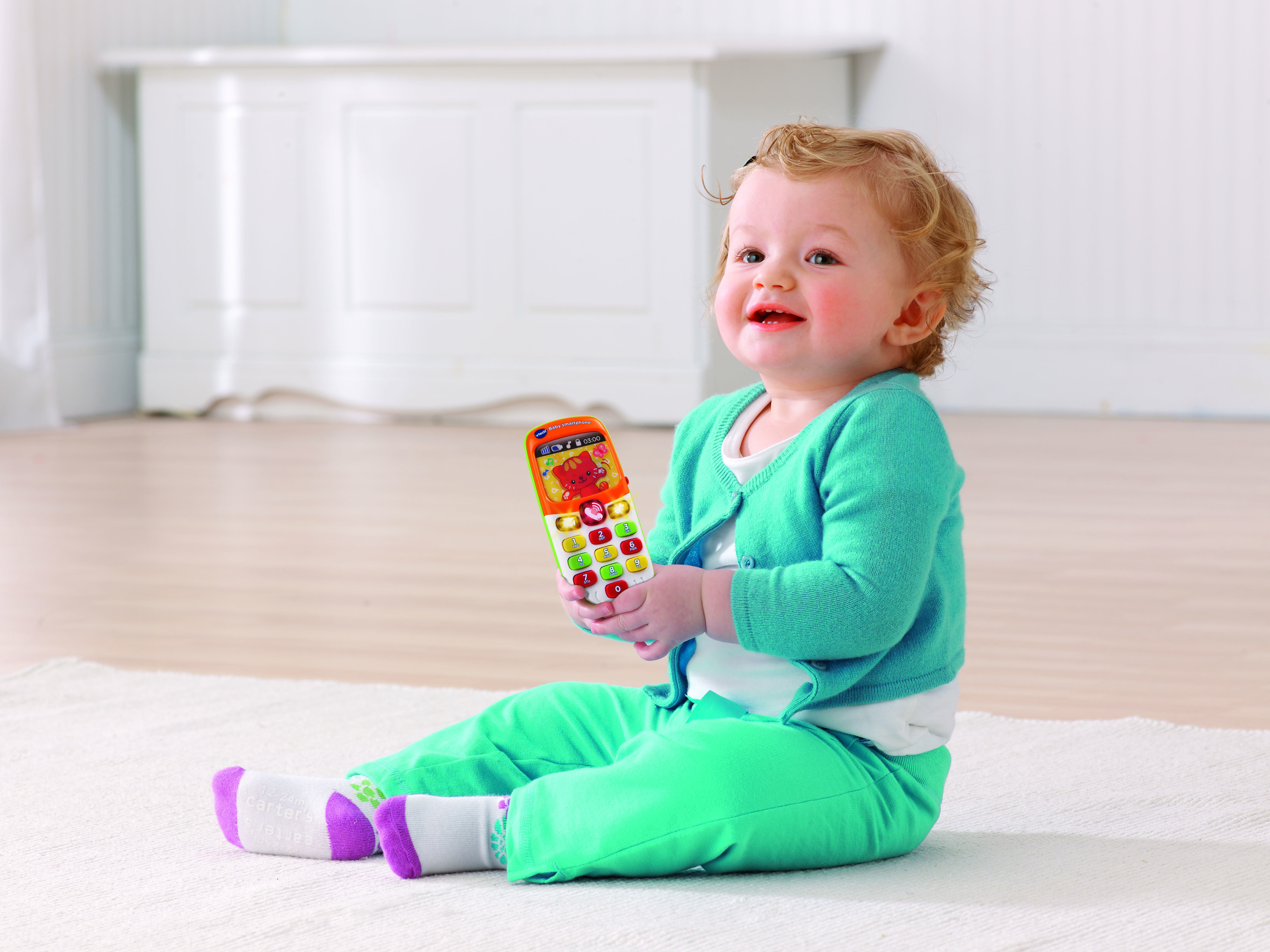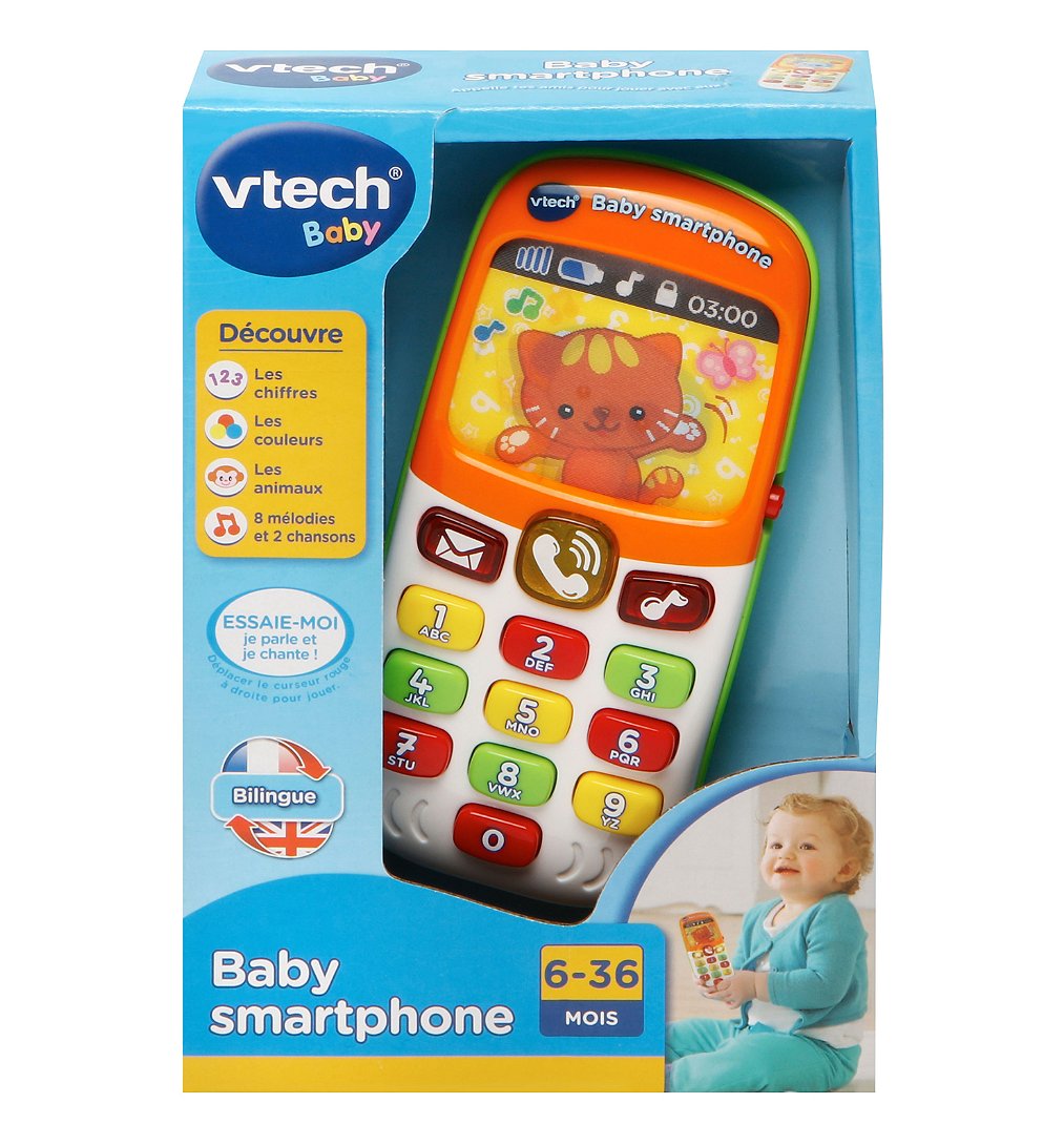 Baby smartphone bilingue - 6 - 36 mois Bébé découvre de joyeuses mélodies et des chansons en jouant à téléphoner comme les grands ! Des effets lumineux attirent l'œil de Bébé et l'incitent à jouer, comme le chien et le chat en hologramme. Il découvre les nombres et les couleurs, en français et en anglais. Magique, le petit chien et le petit chat laissent des messages et Bébé peut les appeler directement ! 8 mélodies et 2 chansons. Boîte Try-me. 2 piles LR03 fournies.