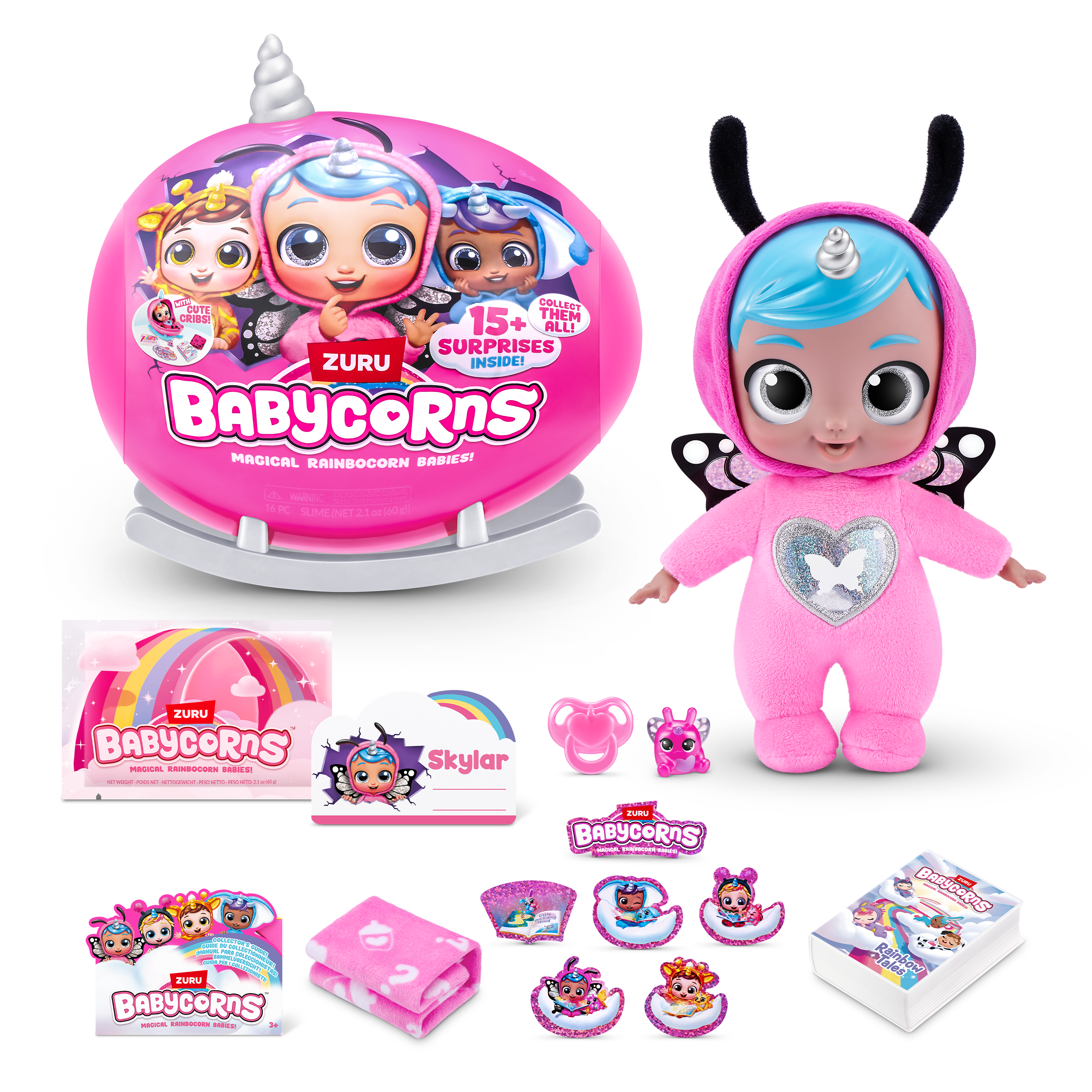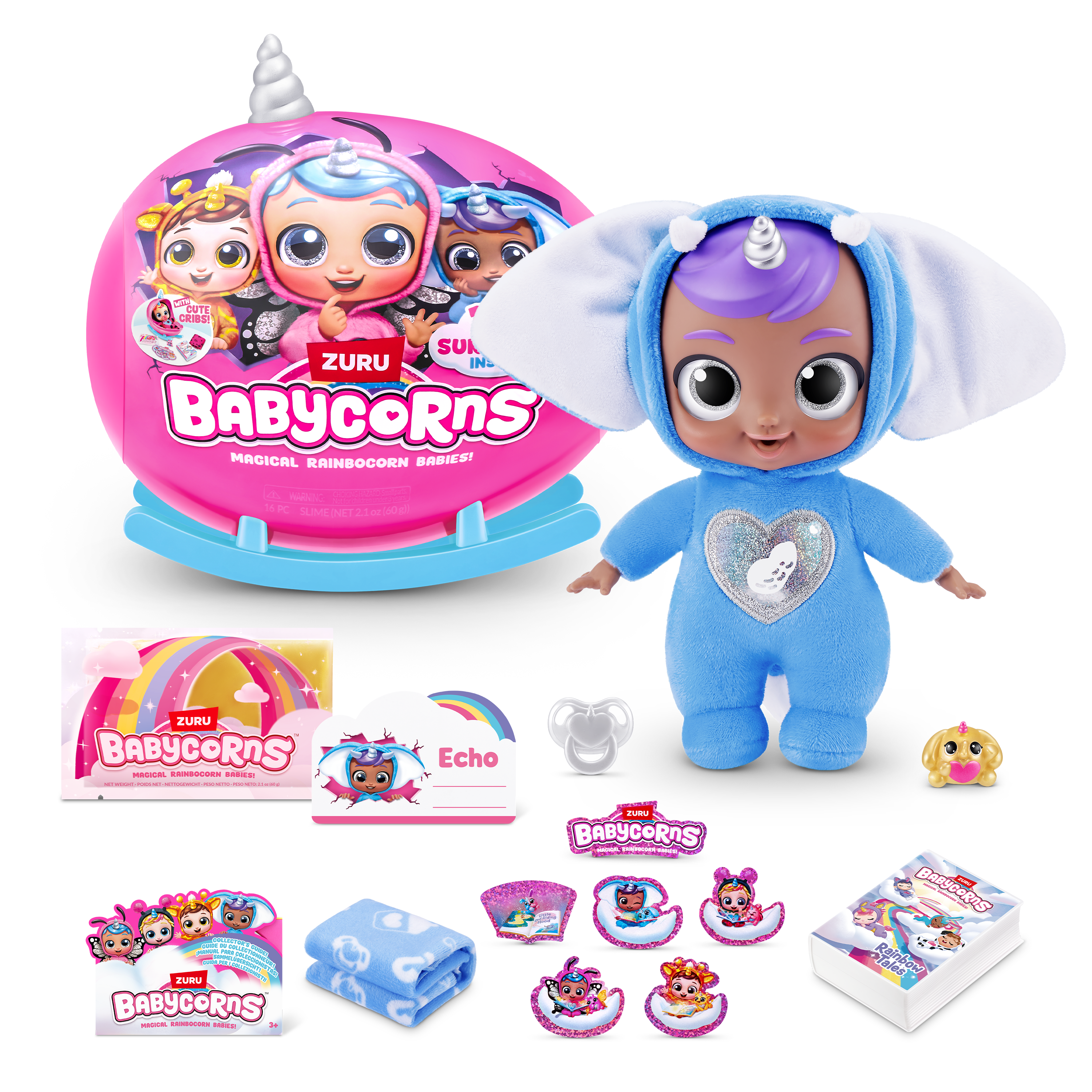 | La boîte contient | 1 berceau magique, 1 poupée Babycorn, 1 livre d’histoires, 1 boo-boocorn, 1 tétine, 1 couverture, 1 carte de bibliothèque, 1 sachet de slime, 6 autocollants, 1 guide du collectionneur, 1 cœur à décoller et à découvrir |