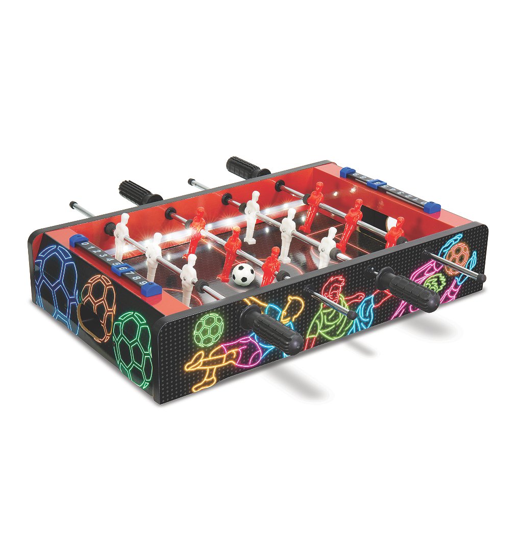 Ce baby-foot combine la qualité d'une construction en bois avec des fonctionnalités modernes pour une expérience de jeu unique. Terrain lumineux : Le véritable atout du jeu ! Des lumières LED illuminent le terrain pour un effet spectaculaire. Design élégant : Le cadre est décoré de motifs fluo stylés et les poignées antidérapantes assurent un contrôle total. Expérience de jeu complète : Réalisez des 'pull shots', des 'rollovers' ou des 'pull kicks' comme de vrais pros !
