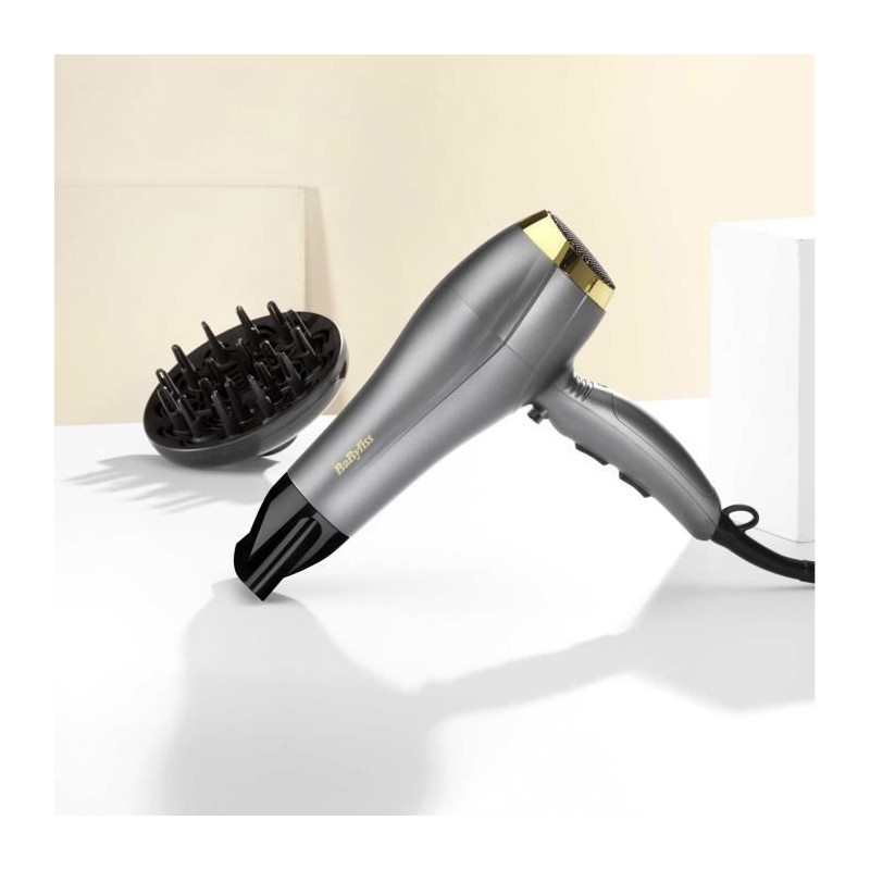Ce sèche-cheveux Titanium Gold de BaByliss est dotée d'une puissance de 2300W. Sa fonction ionique libère des ions pour réduire les frisottis, éliminer l'électricité statique, lisser et renforcer la brillance, pour des cheveux en pleine santé. Ses 3 températures et 2 vitesses vous permettent une coiffure sur-mesure et sa touche air frais vous permet de fixer la coiffure pour une tenue longue durée. Sa technologie titane céramique permet un flux d'air homogène et maitrisé pour un résultat précis. Grâce à son concentrateur, vous pourrez facilement réaliser des brushing précis. Doté également d'un diffuseur, ce sèche-cheveux Keratin Shine 2100 de BaByliss sera votre compagnon idéal pour sécher vos boucles sans les abîmer, pour un résultat ultra naturel et de belles boucles rebondies. Le cordon rotatif de 2,2m offre un grand confort d'utilisation.