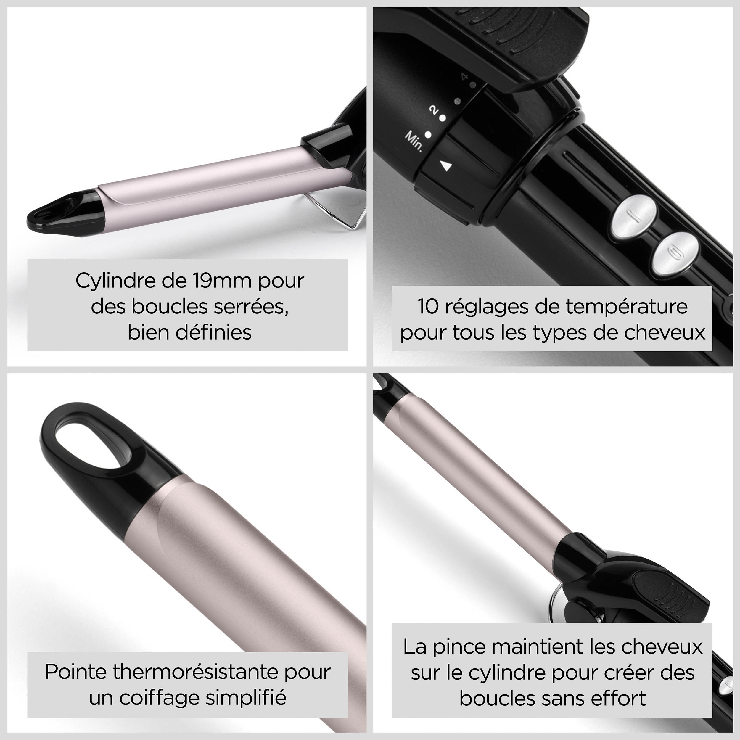 Boucleur professionnel 19 mm pour créer facilement et rapidement des boucles définies. Boucleur avec revêtement satiné ultra-lisse pour créer des boucles serrées longue tenue, au fini soyeux. 10 réglages de températures de 110°C à 180°C pour utilisation sur tous les types de cheveux. • Jusqu'à 180°C • Fer 19 mm • Revêtement advanced Ceramic • Chauffe ultra-rapide • 10 températures • Arrêt automatique • Cordon rotatif 1,8 mètre • Indicateur de chauffe • Support de sécurité intégré • Garantie 2 ans