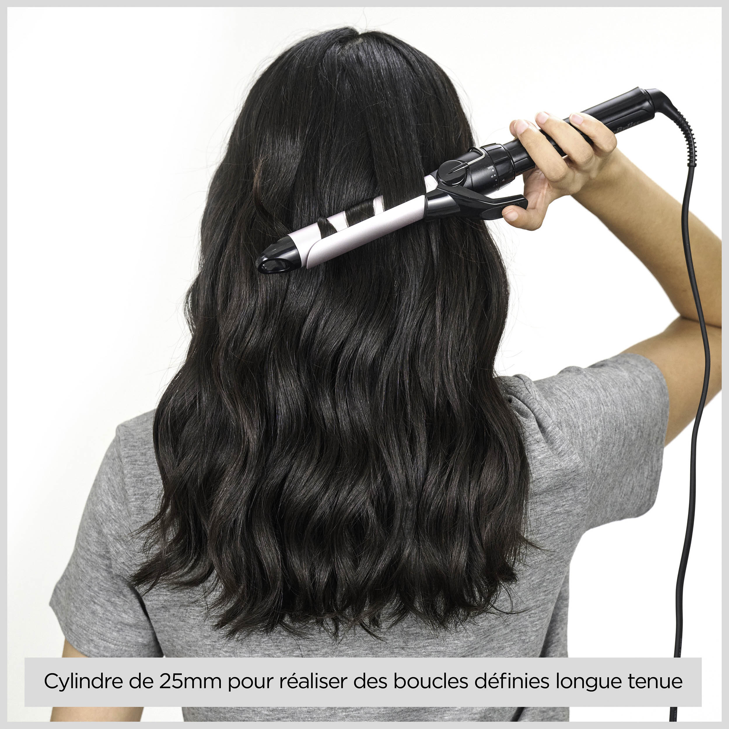 Boucleur professionnel 25 mm pour créer facilement et rapidement des boucles rebondies. Boucleur avec revêtement satiné ultra-lisse pour créer des boucles serrées longue tenue, au fini soyeux. 10 réglages de températures de 110°C à 180°C pour utilisation sur tous les types de cheveux. • Jusqu'à 180°C • Fer 25 mm • Revêtement satiné ultra lisse • Chauffe ultra-rapide • 10 températures • Arrêt automatique • Cordon rotatif 1,8 mètre • Indicateur de chauffe • Support de sécurité intégré • Garantie 2 ans
