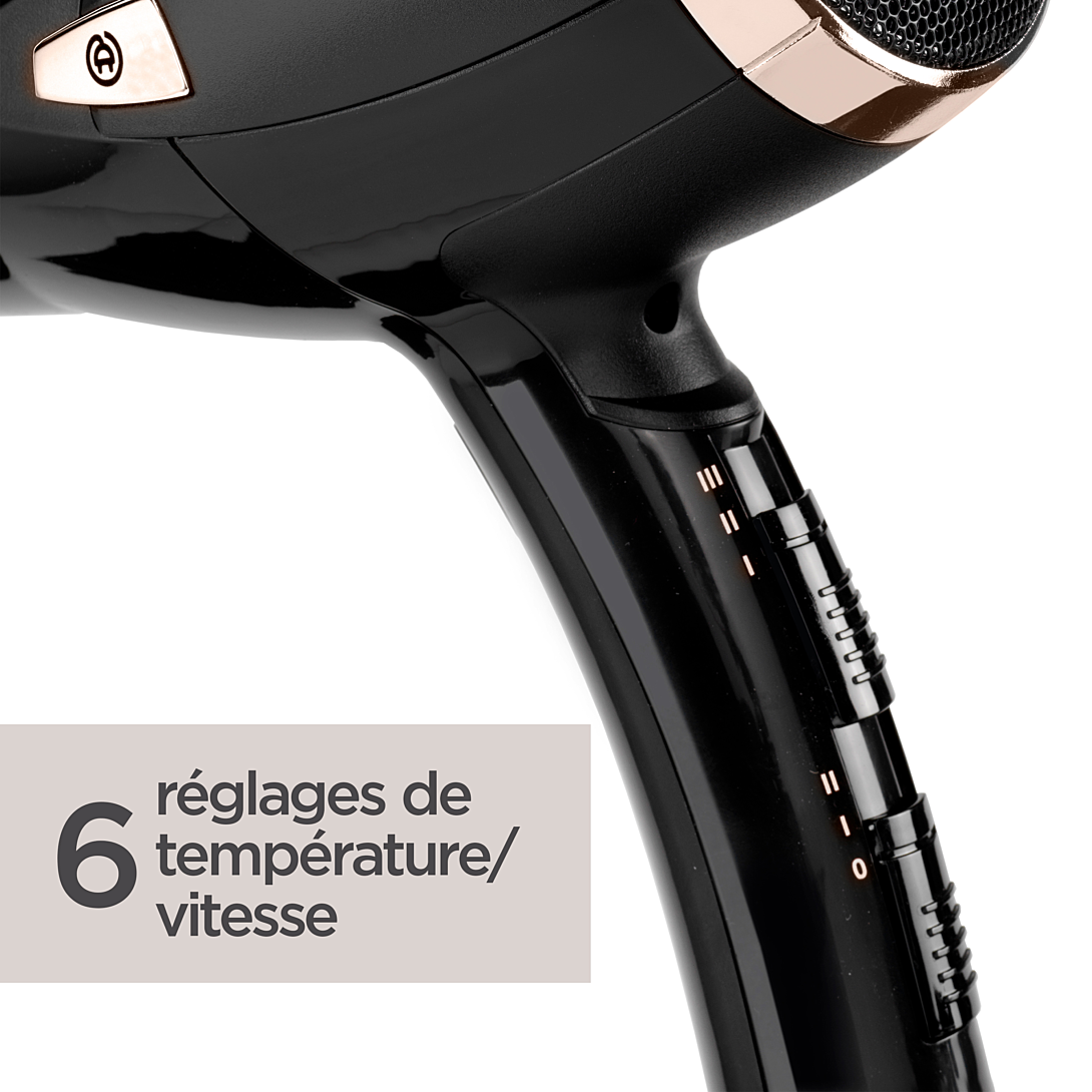 Ce sèche-cheveux puissant de 2000W offre des résultats rapides. Doté d'un cordon rétractable unique, il permet un rangement parfait, en toute sécurité et sans nœud ! Il suffit d'appuyer sur un bouton pour rétracter le cordon dans le manche du sèche-cheveux. Sa fonction ionique débarrasse vos cheveux des frisottis et apporte un fini soyeux. Il comprend également un diffuseur et un concentrateur fin pour sécher en douceur les boucles naturelles et réaliser des lissages ainsi que des brushings. Flux d'air rapide et contrôlé • 2000W • Flux d'air rapide et contrôlé • Fonction ionique anti-frisottis • 3 températures / 2 vitesses • Bouton air frais • Concentrateur • Diffuseur sublimateur de boucles • Cordon rétractable 1,95 mètre • Garantie 3 ans