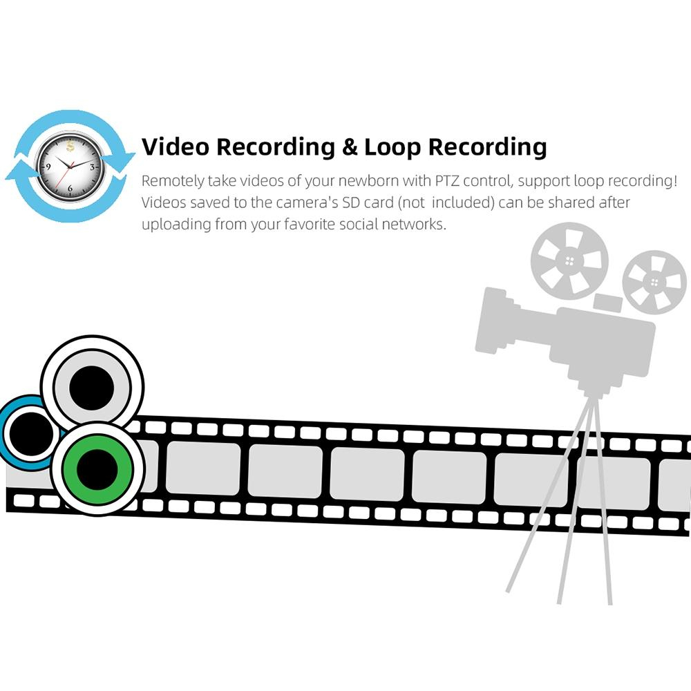 - Prise en charge de l'alarme de pleurs, berceuse, rappel de l'heure de l'alimentation, vision nocturne automatique, alarme de température et enregistrement de la caméra