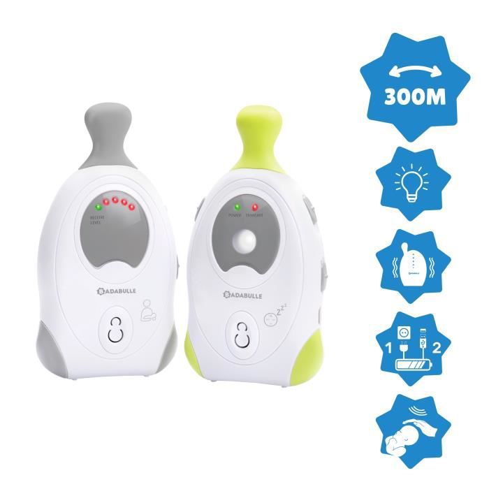 Grâce a sa portée de 300 metres, le baby online 300m+ le Badabulle est le baby phone audio idéal pour les familles vivant en appartement. - simple d'utilisation et sûr, cet écoute bébé offre toutes les fonctions indispensables : alerte visuelle, mode continu ou vox (activation a la voix), alarme sonore ou vibreur et indicateur de batterie faible. - un vrai plus, le baby online 300m+ est doté d'une veilleuse pour ra