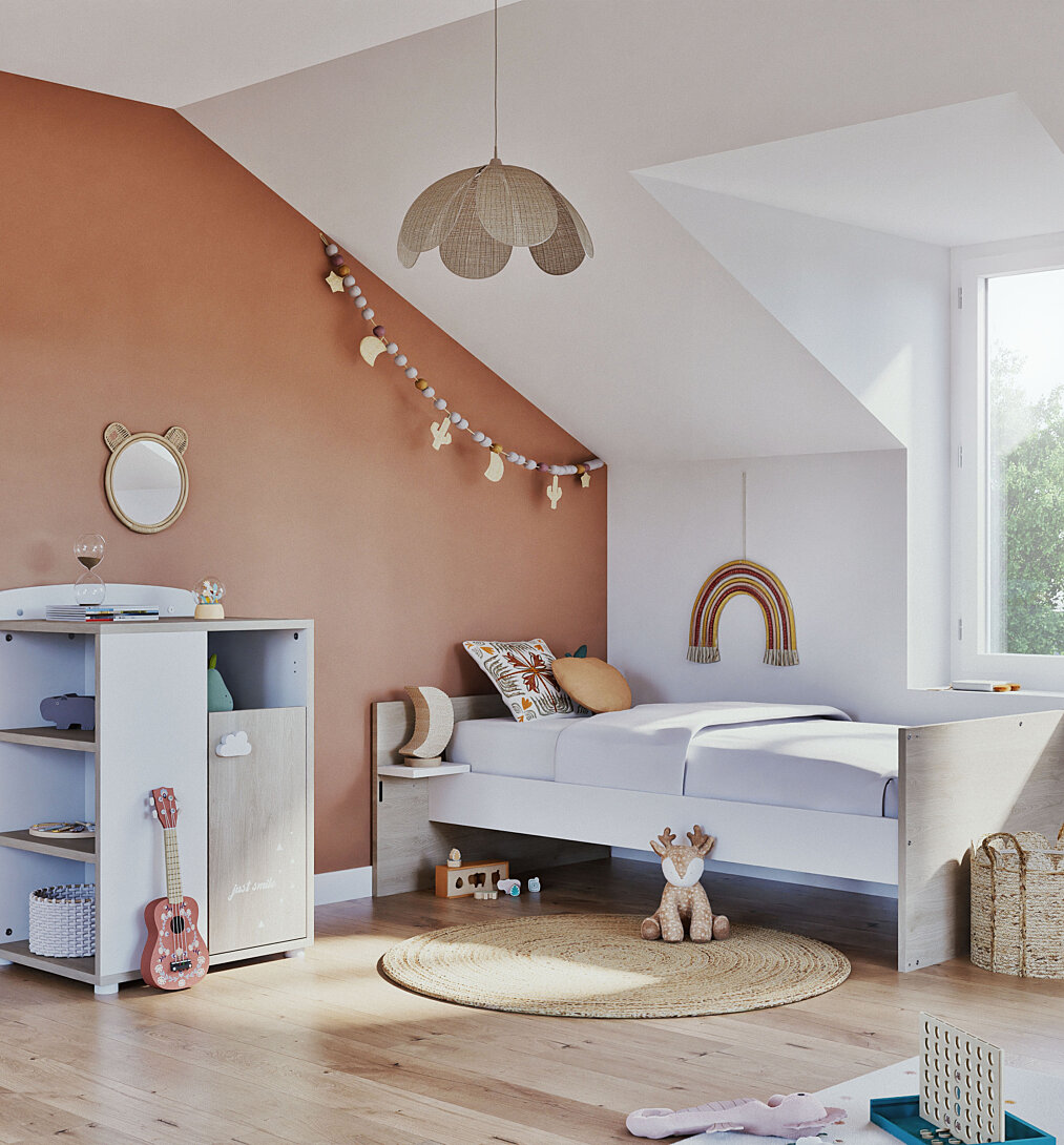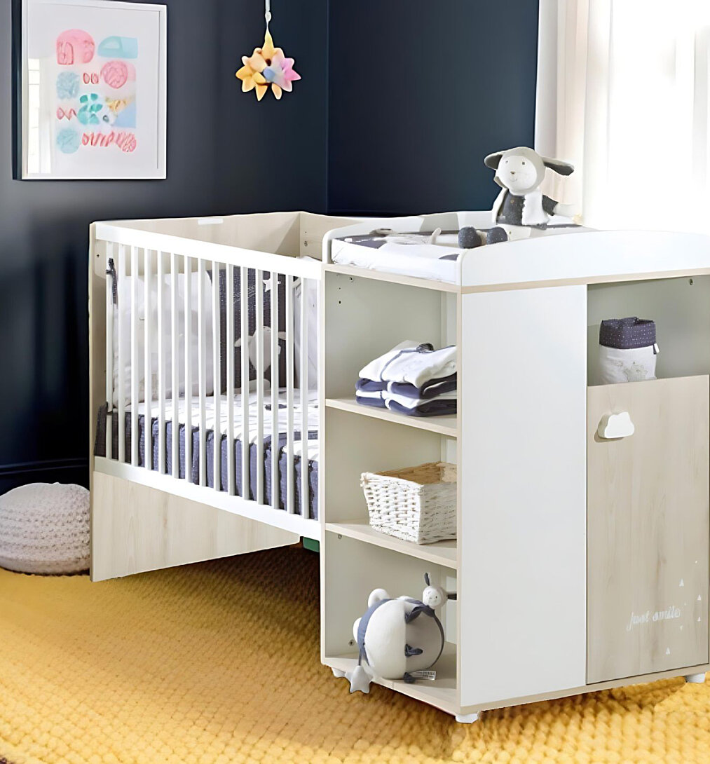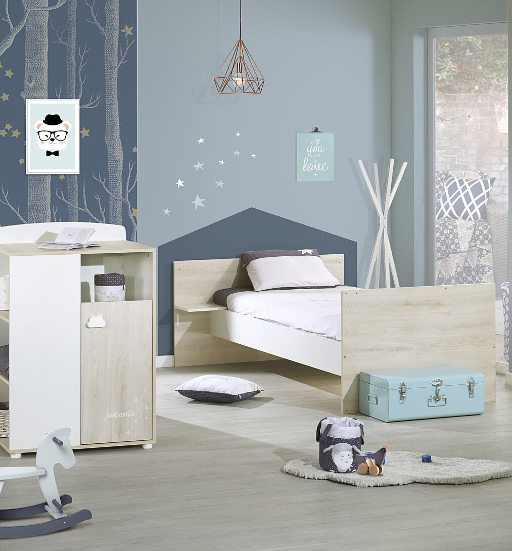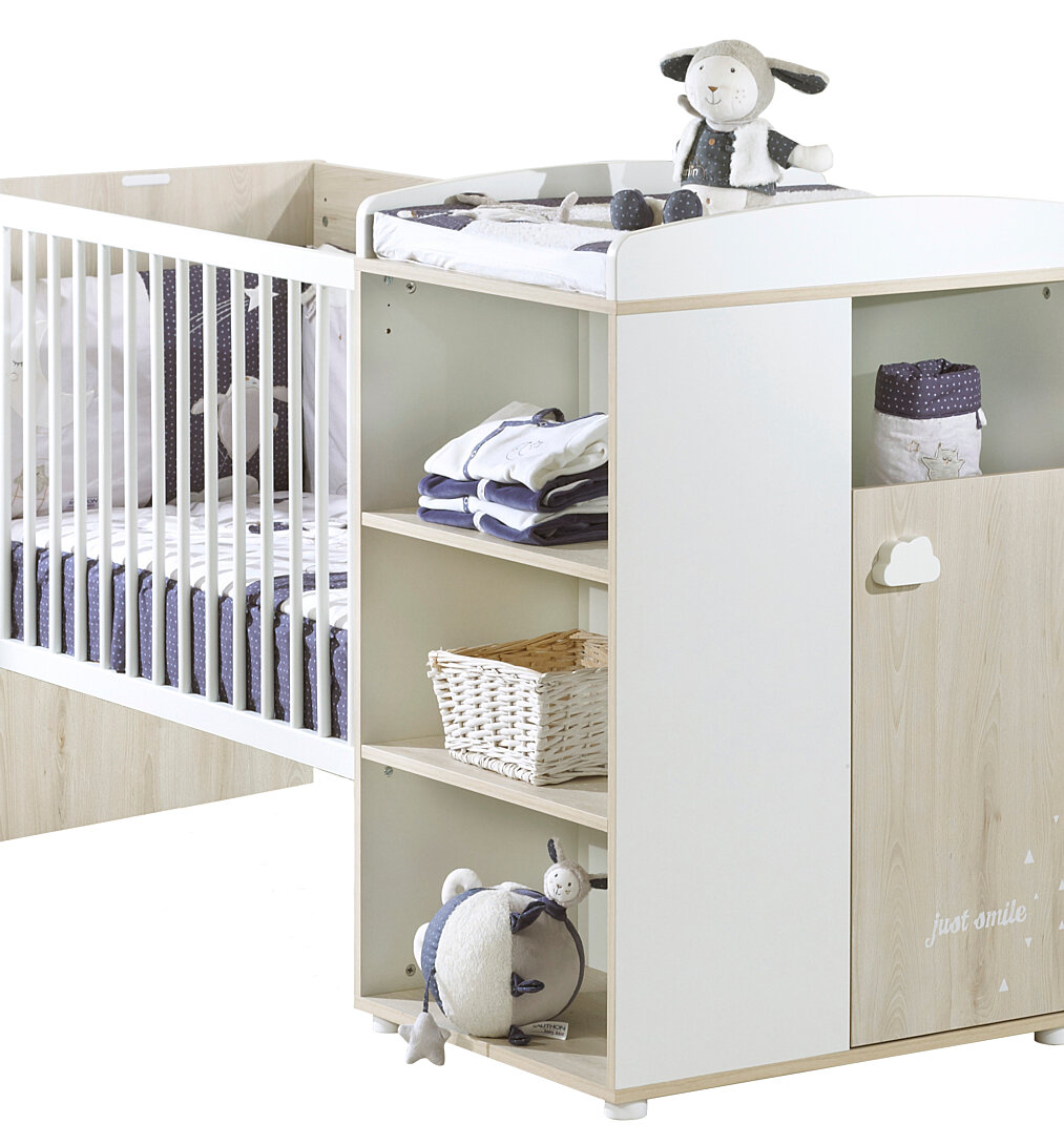 "Lit bébé combiné 120x60 évolutif en lit junior de 90x190 cm - Hetre Cendré et blanc - Boutons nuage et décor ""Just Smile"" par sérigraphie - 2 galeries fixes - Sommier réglable en hauteur 3 positions - commode a langer - Garanti sans solvant - Fabrication française - Mixte - Des la naissance - Livré a l'unité *Matelas et literie non fournis"