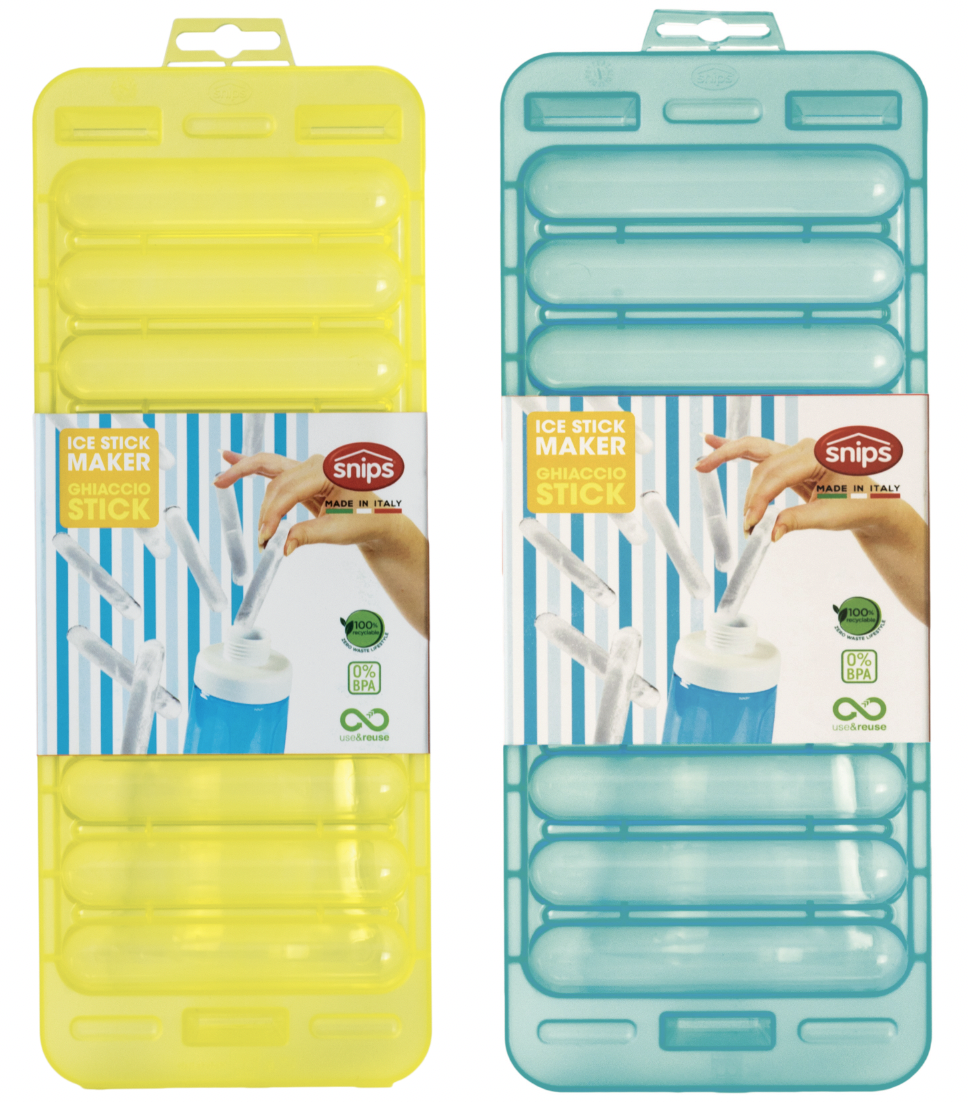 Bac à glaçons pour glaçon en forme de bâtonnet. Idéal pour pouvoir insérer les glaçons dans les bouteilles ou les gourdes ! Disponible en bleu ou en jaune. Peut passer au lave vaisselle. Fabriqué en Italie. Matière : polypropylène.