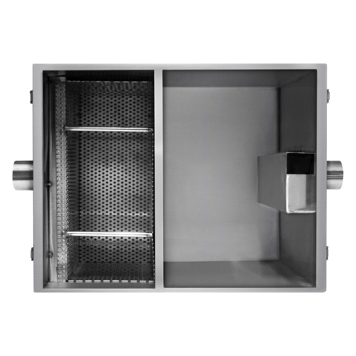 L'intérieur intelligemment conçu intègre un grand panier qui capturera les déchets alimentaires. De nombreux petits trous permettent à l'eau de s'écouler à travers le panier tandis que l'huile contenue remonte à la surface. Pour assurer une séparation maximale des graisses, le réservoir est séparé par un déflecteur, créant deux sections distinctes. Avec un dégagement de 2 cm sous le déflecteur, l'eau peut être transférée sans effort, en la séparant de l'huile et en la dirigeant vers la sortie de 50 mm sur le côté droit pour une élimination tout en douceur.