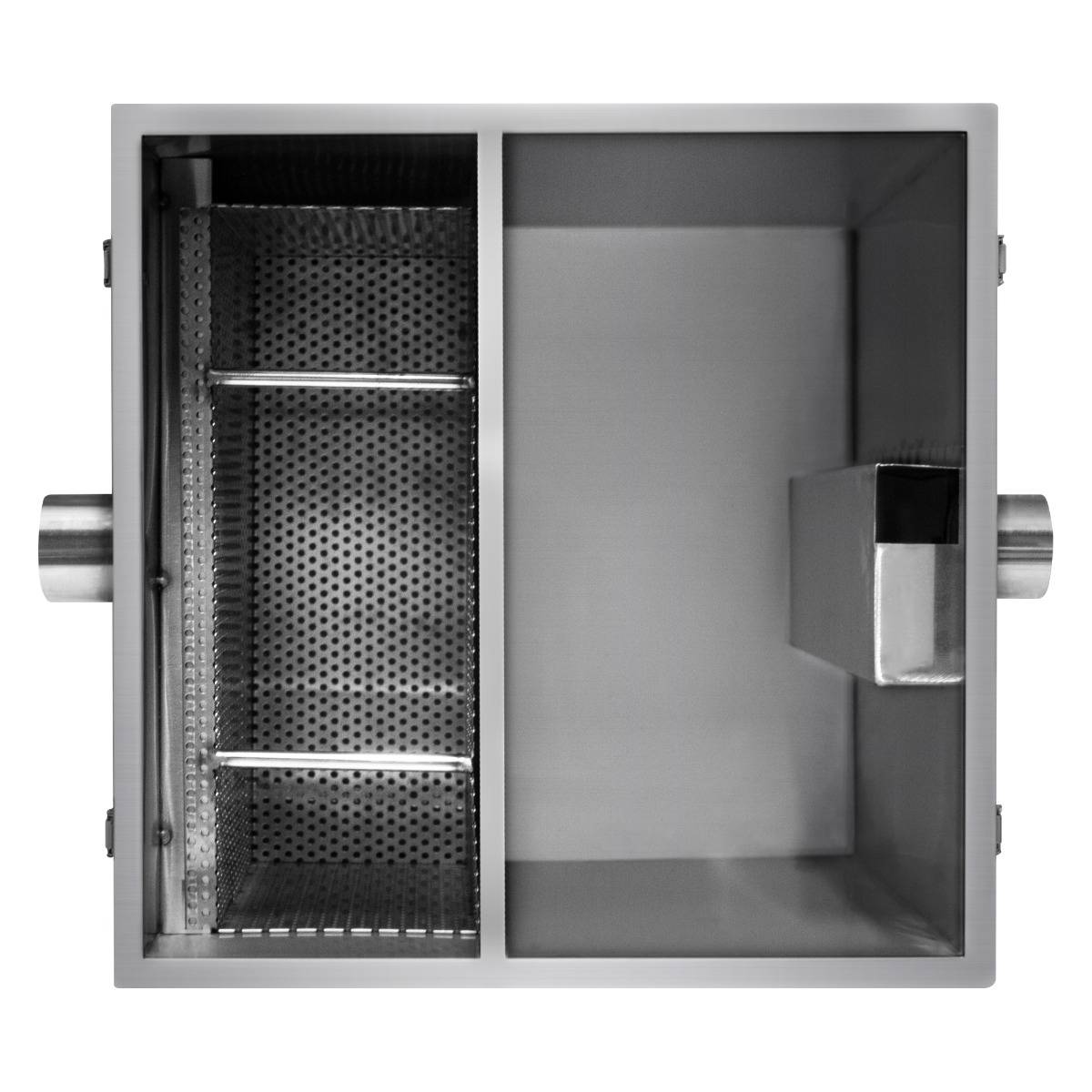 L'intérieur intelligemment conçu intègre un grand panier qui capturera les déchets alimentaires. De nombreux petits trous permettent à l'eau de s'écouler à travers le panier tandis que l'huile contenue remonte à la surface. Pour assurer une séparation maximale des graisses, le réservoir est séparé par un déflecteur, créant deux sections distinctes. Avec un dégagement de 2 cm sous le déflecteur, l'eau peut être transférée sans effort, en la séparant de l'huile et en la dirigeant vers la sortie de 50 mm sur le côté droit pour une élimination tout en douceur.