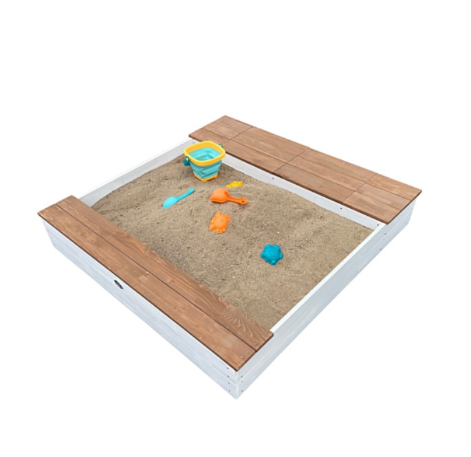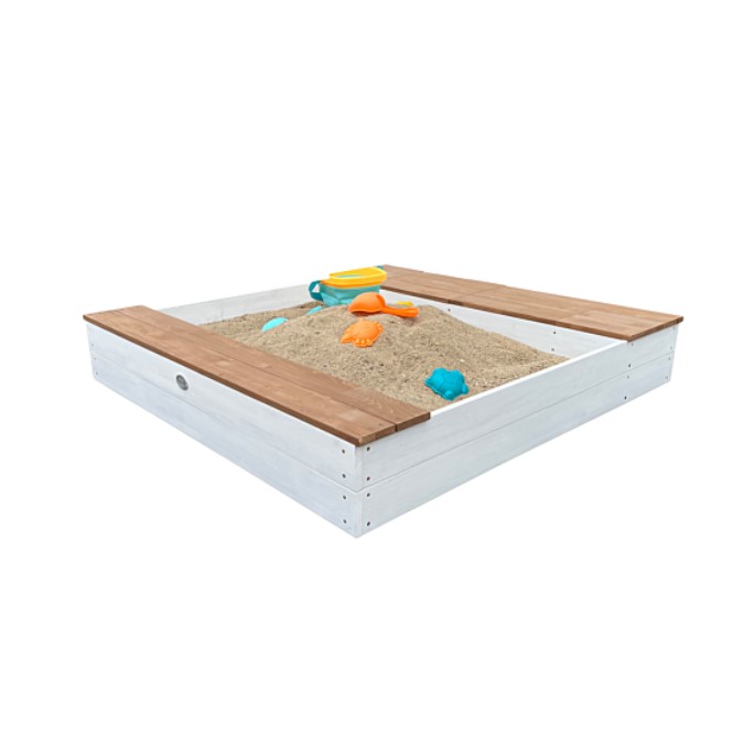 | Libellé | Bac à sable en bois AXI Evy avec bacs à eau, banc et espace de rangement | Bac à sable en gris et marron avec tapis de sol et bâche | 119 x 117 cm |