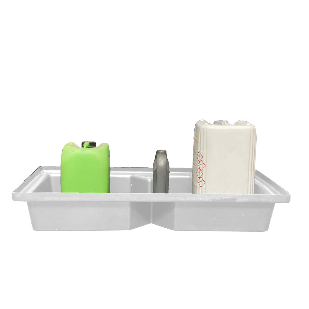 Capacité : 70L_ Longueur : 52 cm_Hauteur : 17 cm_ Largeur : 102 cm._Poids : 5 kg_ Pour stockage bidons et liquides dangereux_ Matière : polyéthylène haute densité (contact alimentaire)_ Très résistant aux chocs. plage d'utilisation : -30°C à +60°C_ 100% recyclable-empilable pour un rangement optimisé_Fabrication Française_Marque : PLAST'UP ROTOMOULAGE