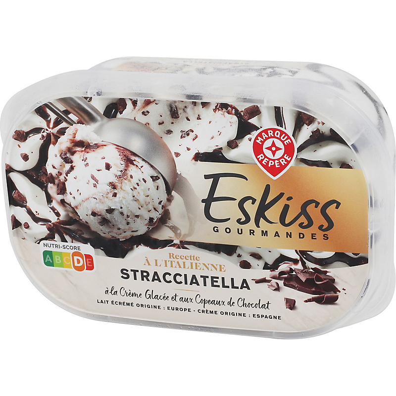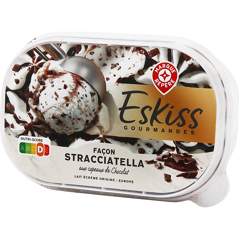 Glace à la vanille (79 %) avec des inclusions de morceaux de chocolat (5 %) et avec une sauce au chocolat (14 %). Décor : copeaux de chocolat (2 %). ESKISS