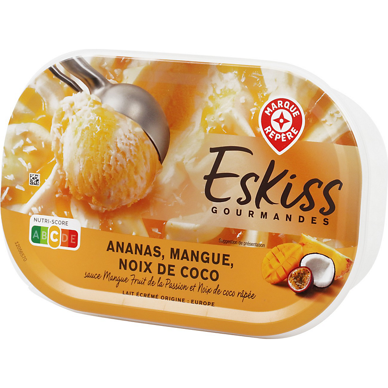 Ingrédients : eau ; sucre ; purée de mangue 10,8 % ; jus d'ananas à base de concentré 10,6 % ; lait écrémé réhydraté ; sirop de glucose ; poudre de lait de noix de coco 2,4 % (lait de noix de coco, maltodextrine, caséinate de sodium (lait)) ; poudre de lactosérum ; noix de coco râpée 1 % ; émulsifiant : E471 ; gélifiants : farine de graines de caroube, gomme guar, pectines, gomme xanthane, gomme Tara ; jus de fruit de la passion concentré 0,4 % ; jus de citron concentré ; arôme naturel d’ananas ; arôme naturel de noix de coco ; protéines de pois hydrolysées ; concentré de carotte ; acidifiant : acide citrique ; concentré de carthame ; arôme naturel de mangue ; colorant : caroténoïdes ; arôme naturel de fruit de la passion.