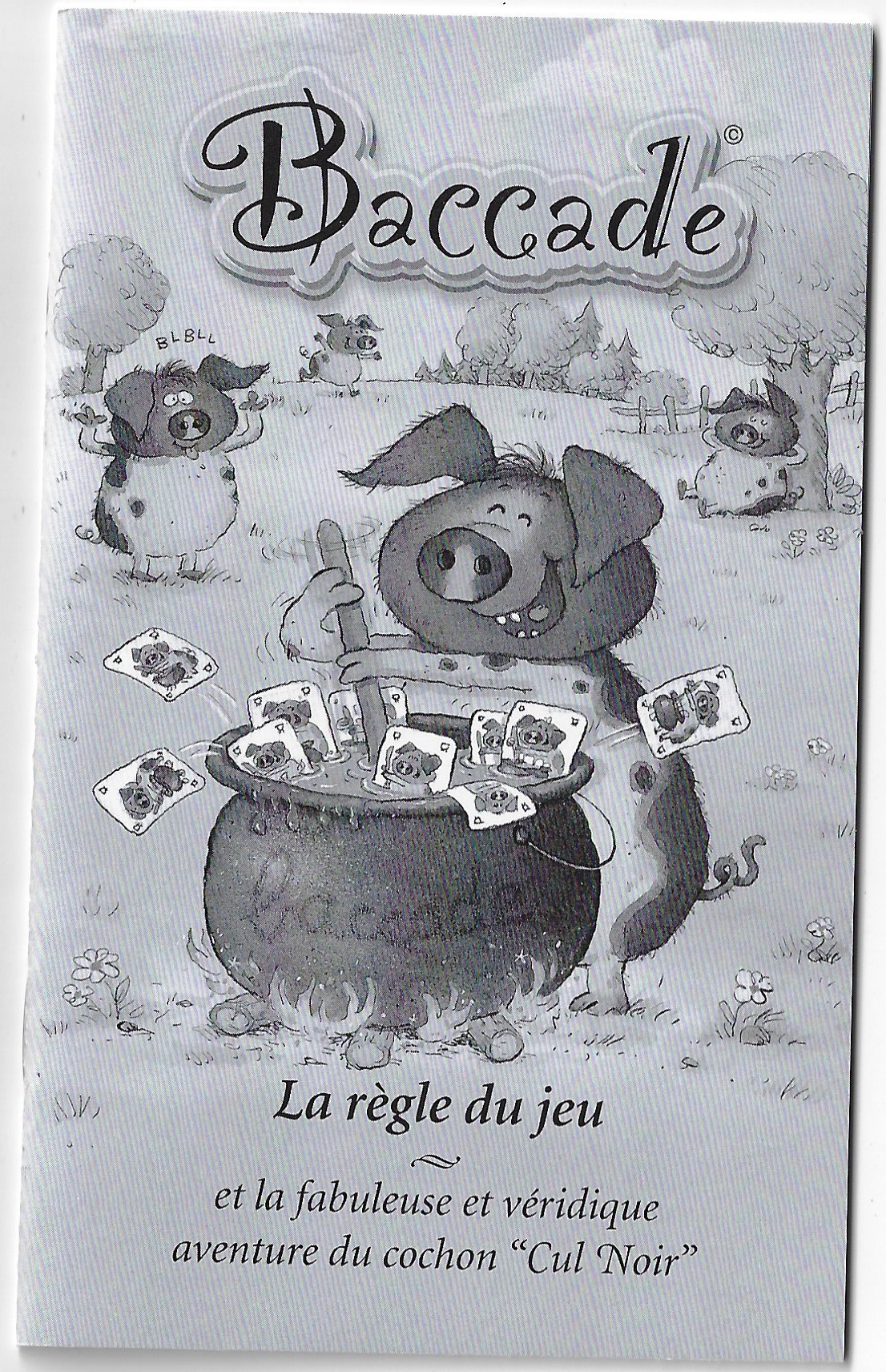 | La boîte contient | 96 cartes (dont 4 cartes talons), 1 livret d'histoire, 1 livret de 16 pages comprenant la règle du jeu et un petit historique du cochon «Cul-Noir». 92 cartes réparties en: 36 cartes "cochon" (six familles de couleurs différentes, chaque famille comporte 6 cochons différents), 36 cartes "patate" (six familles de couleurs différentes, chaque famille comporte 6 patates différentes), 6 cartes "confiture (trois "confiture de cochons, trois "confiture de patates), 4 cartes "tour de cochon", 4 cartes "cochonne", 3 cartes "baccade", 3 cartes "joker cul noir" (Suiffine, Grobedon et Gédular). |