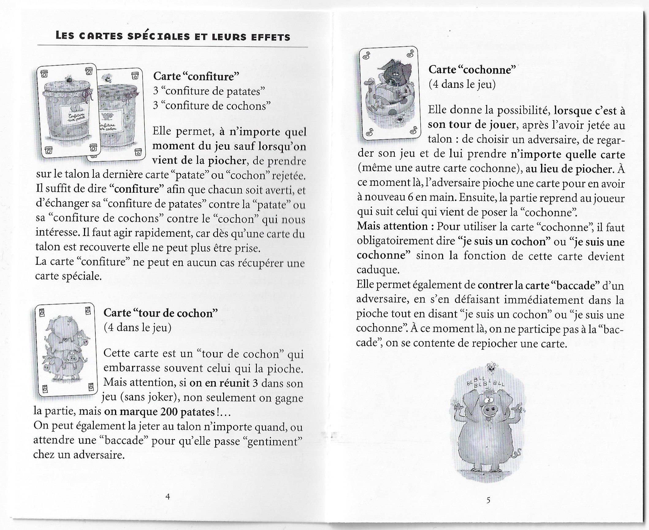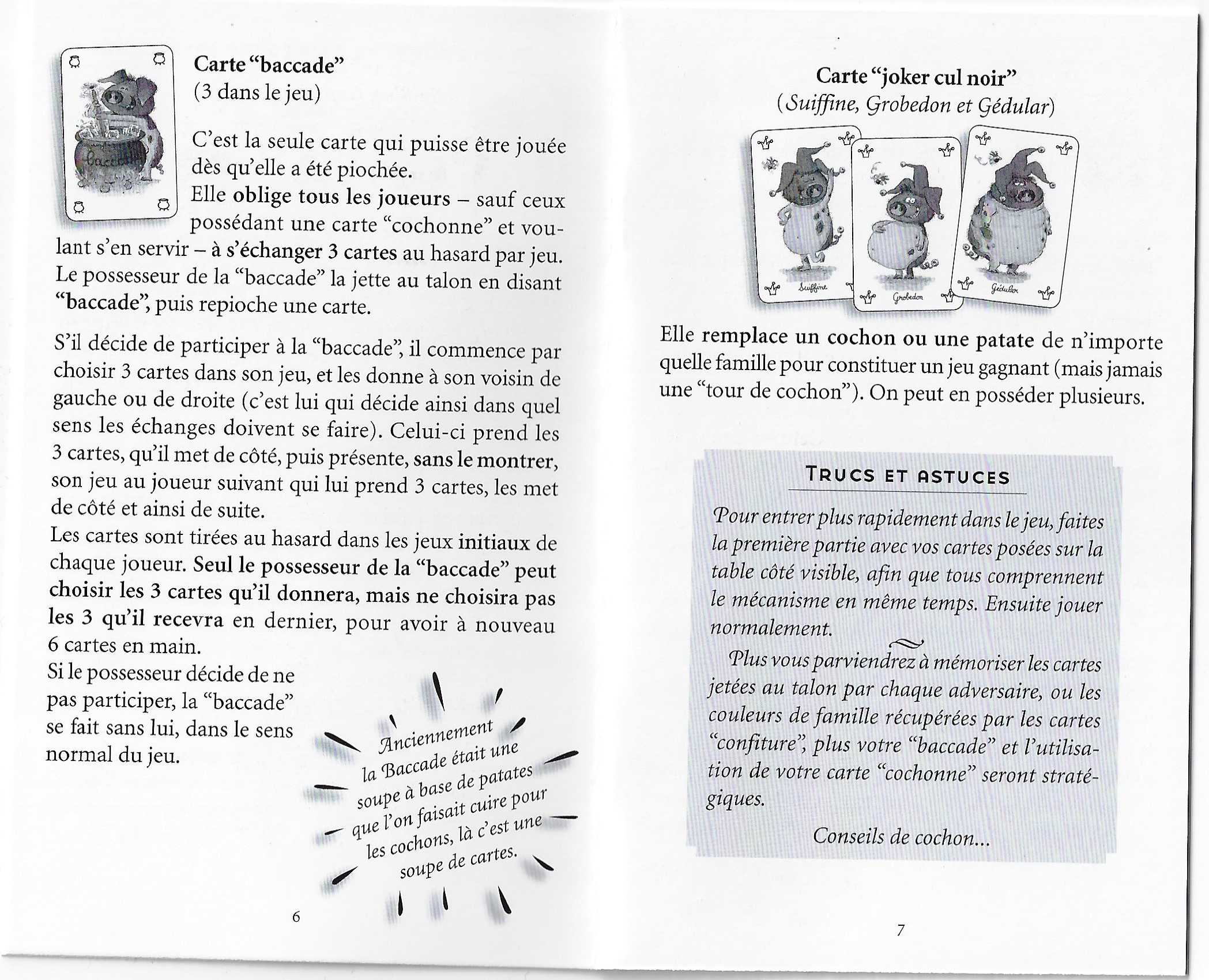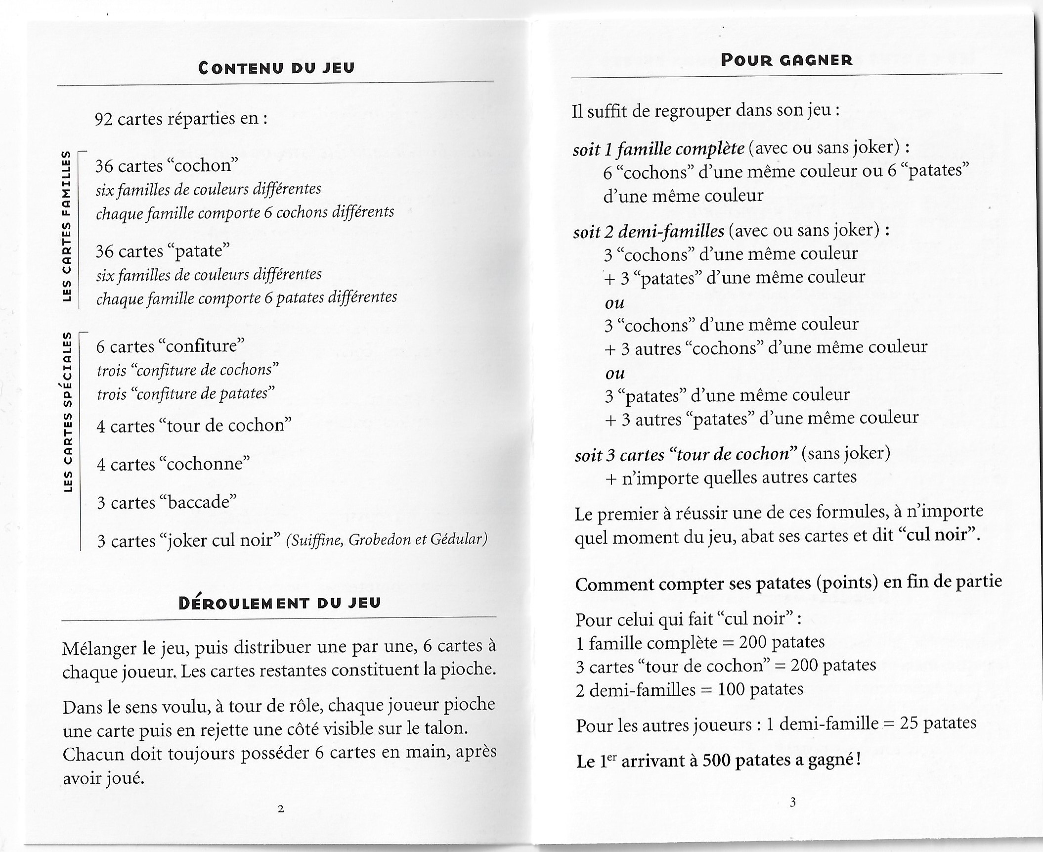 Deroulement du jeu: mélanger le jeu, puis distribuer une par une, 6 cartes a chaque joueur. Les cartes restantes constituent la pioche. Dans le sens voulu, à tour de rôle, chaque joueur pioche une carte puis en rejette une côté visible sur le talon. Chacun doit toujours posséder 6 cartes en main, après avoir joué. Pour gagner Il suffit de regrouper dans son jeu : soit 1 famille complète (avec ou sans joker): 6 "cochons" d'une même couleur ou 6 "patates" d'une même couleur. soit 2 demi-familles (avec ou sans joker) : 3 "cochons" d'une même couleur + 3 "patates" d'une même couleur, ou 3 "cochons" d'une même couleur + 3 autres "cochons" d'une même couleur, ou 3 "patates" d'une même couleur + 3 autres "patates" d'une même couleur. soit 3 cartes "tour de cochon" (sans joker) + n'importe quelles autres cartes. Le premier à réussir une de ces formules, à n'importe quel moment du jeu, abat ses cartes et dit "cul noir". Comment compter ses patates (points) en fin de partie. Pour celui qui fait "cul noir": 1 famille complète = 200 patates 3 cartes "tour de cochon" = 200 patates 2 demi-familles = 100 patates Pour les autres joueurs : 1 demi-famille = 25 patates Le 1er arrivant à 500 patates a gagné!