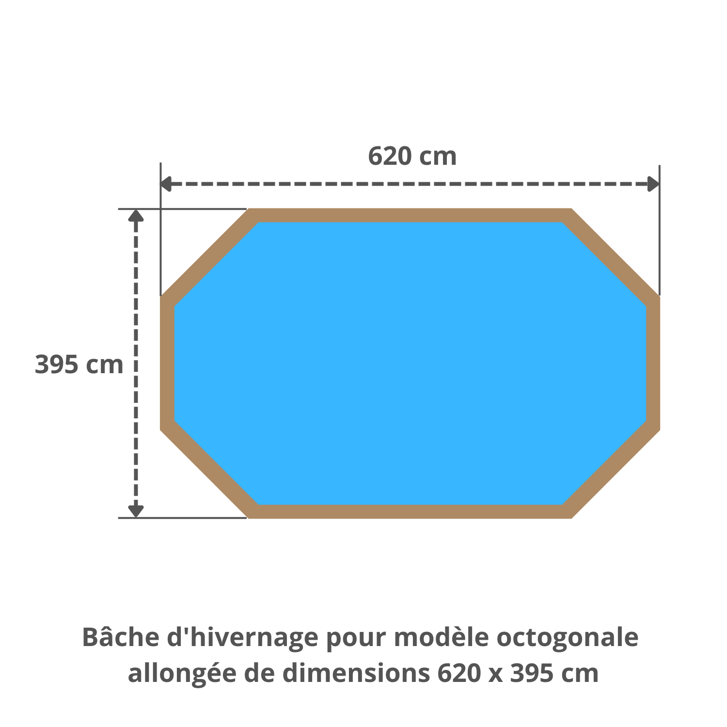 Couverture d'hivernage de sécurité pour la piscine hors-sol bois Gré Sunbay Safran 2 - 620 x 395 cm (octogonale allongée). Toile très résistante (640gr/m²) de couleur beige. La bâche possède une retombée de 7 cm doublée, un renfort à chaque angle et des œillets inox. Des petits trous permettent l'évacuation des eaux pluviales. Pour la fixation, nous vous fournissons le sandow (câble élastique) et les crochets. Aucune découpe n'est prévue pour l'échelle.
