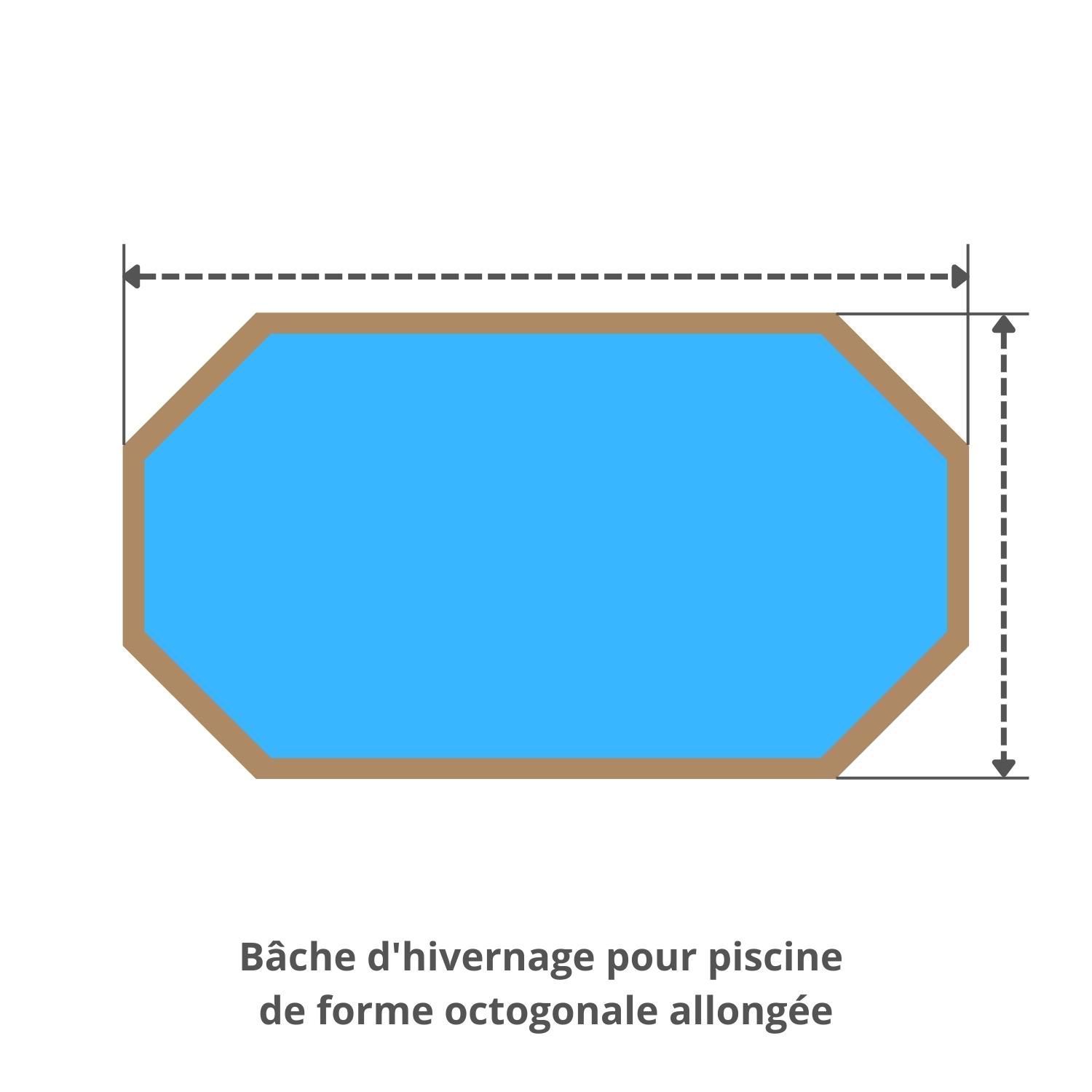 Couverture d'hivernage de sécurité pour la piscine hors-sol bois Nebraska 711 x 400 cm (octogonale allongée). Toile très résistante (580gr/m²) de couleur vert amande. La bâche possède une retombée de 7 cm doublée, un renfort à chaque angle et des œillets inox. Des petits trous permettent l'évacuation des eaux pluviales. Pour la fixation, nous vous fournissons le sandow (câble élastique) et les crochets. Aucune découpe n'est prévue pour l'échelle.
