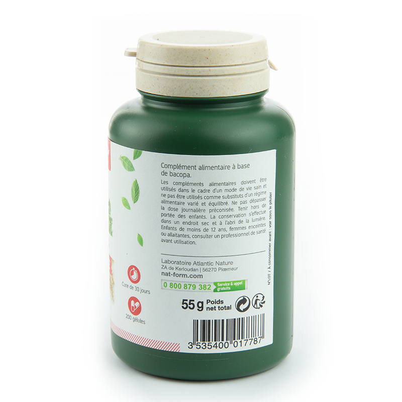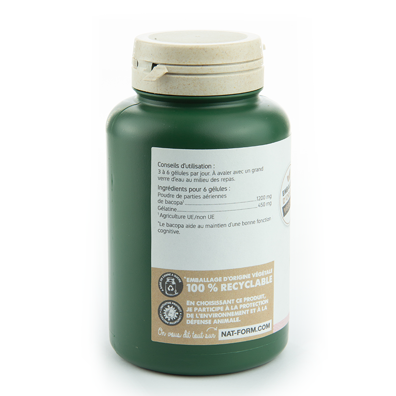 Ingrédients pour 6 gélules : Poudre de parties aériennes de bacopa 1200 mg Gélatine 450 mg