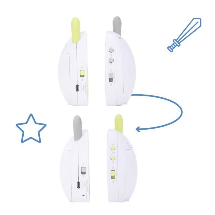 Basse puissance d'émission - Portée de 500m -Veilleuse Mode VOX (activation a la voix) ou en continu - 2 canaux sélectionnables - Mode vibreur - Analogique -Fonctionnement sur piles ou secteur -1 adaptateur secteur + 1 câble de rechargement micro-USB fourni