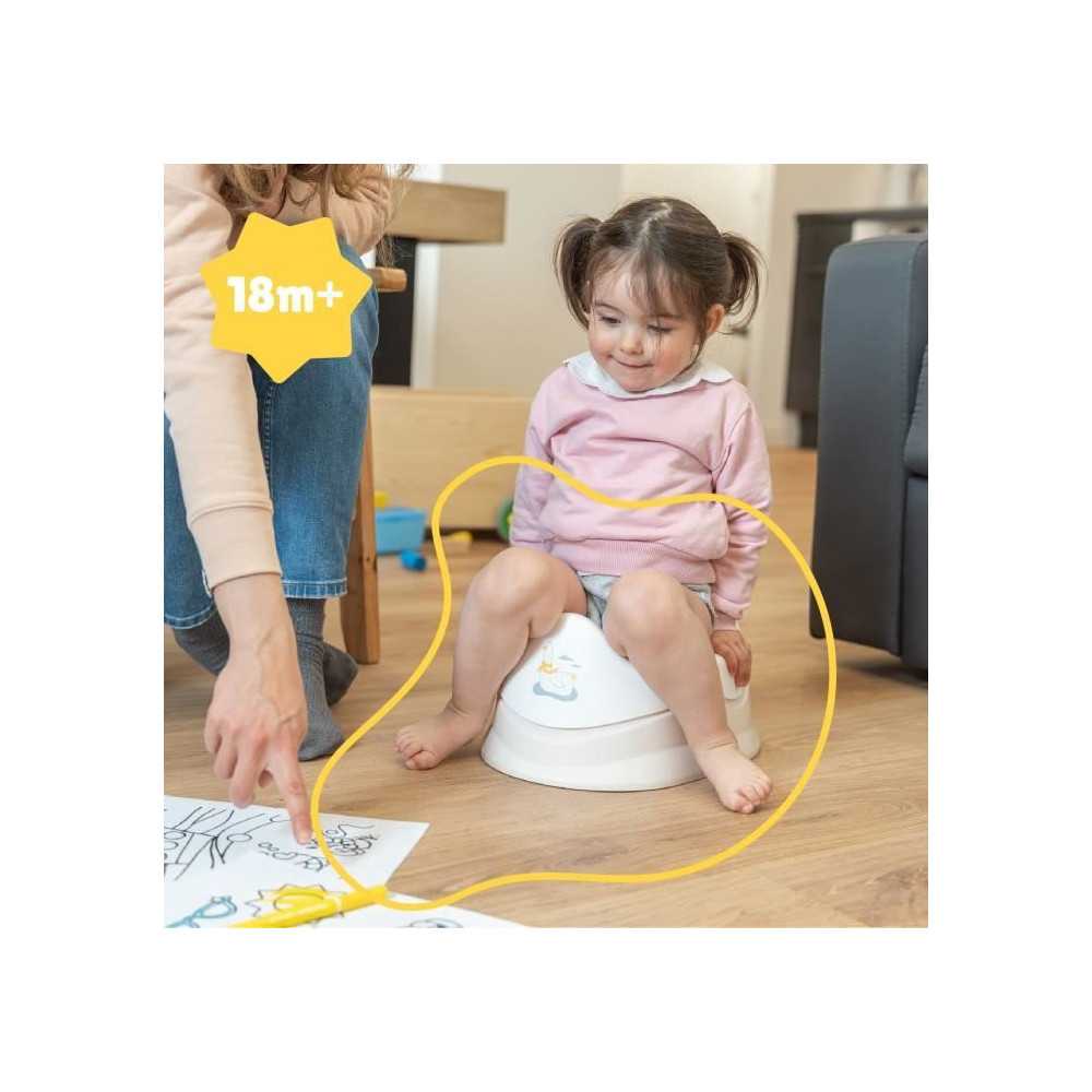 | Plus produit | Assise ergonomique avec petit dossier ; cuvette amovible facile à nettoyer ; poignée arrière pour déplacer ; pare-éclaboussures avant détachable ; 4 patins antidérapants pour stabilité ; décor mouette ; adapté dès 18 mois |