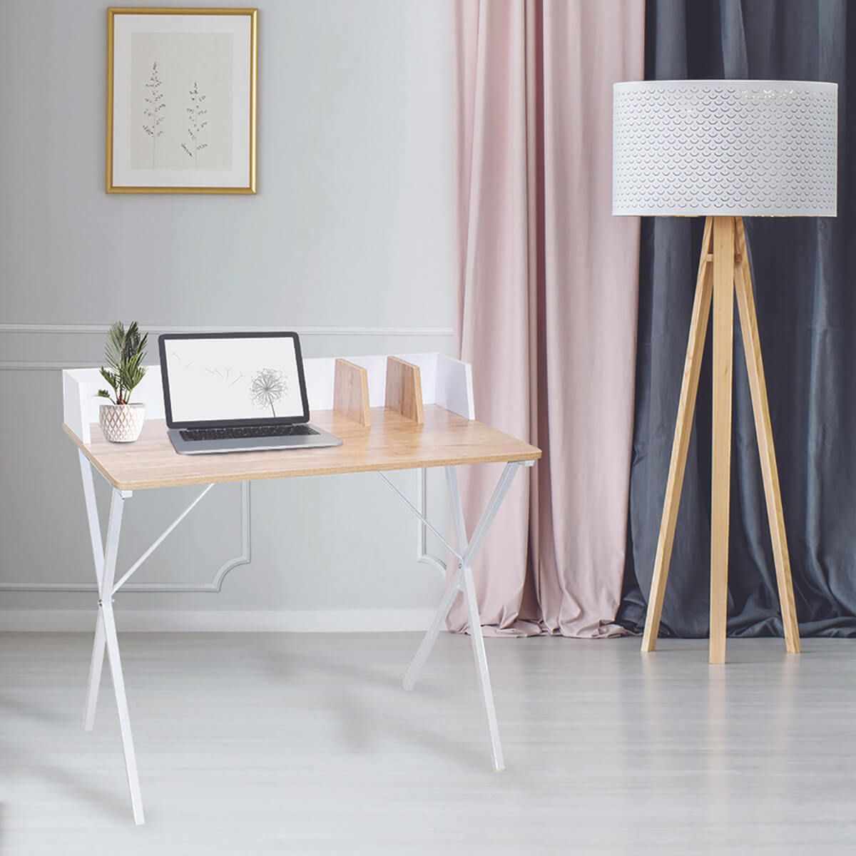 | Plus produit | Bureau Badie Plateau Effet Bois et Piètement Blanc : Un bureau au look épuré dont l'agencement vous permettra d'organiser un espace de travail peu encombrant |