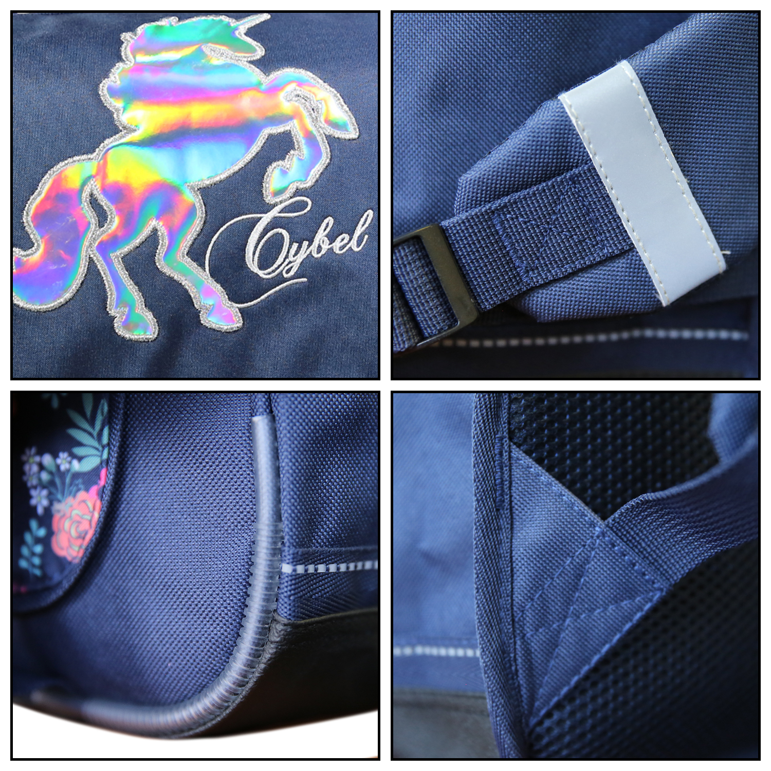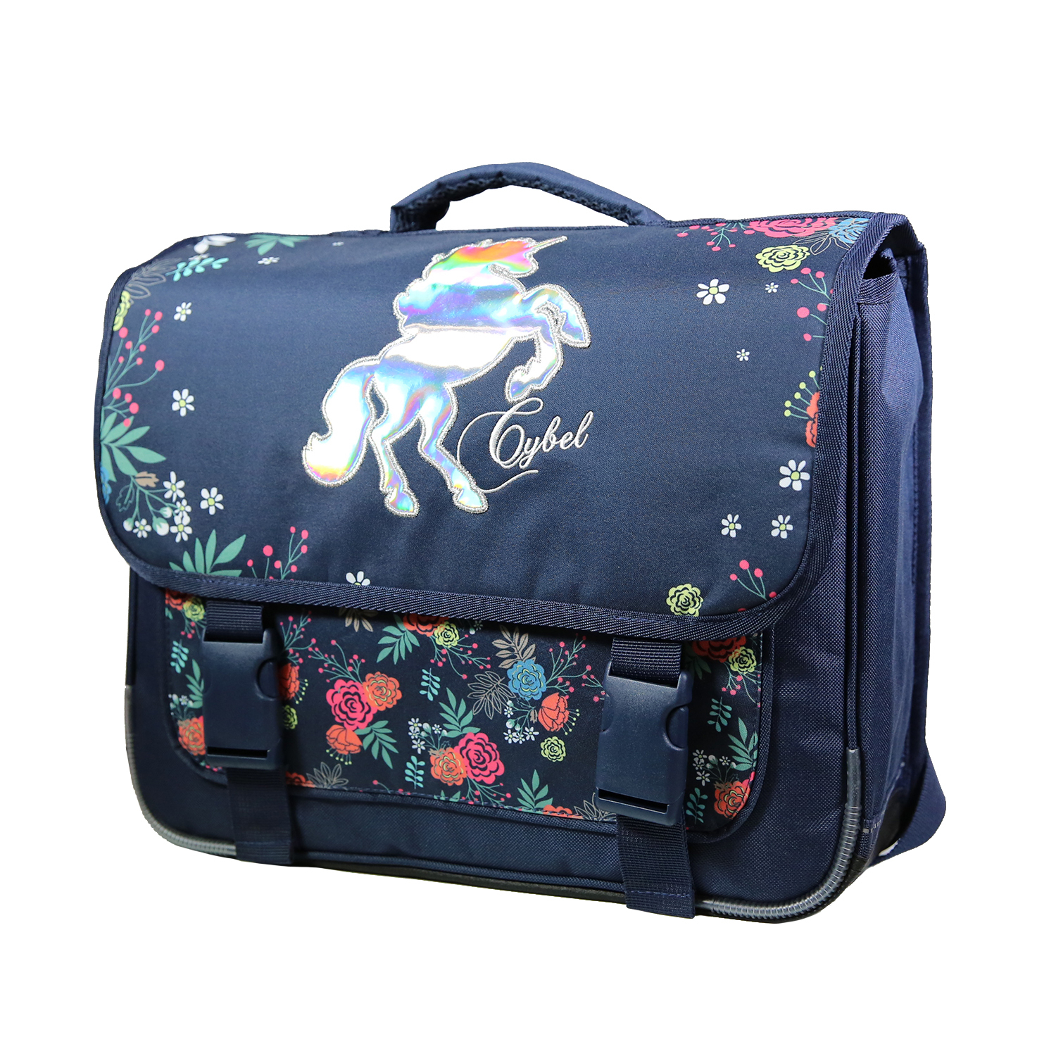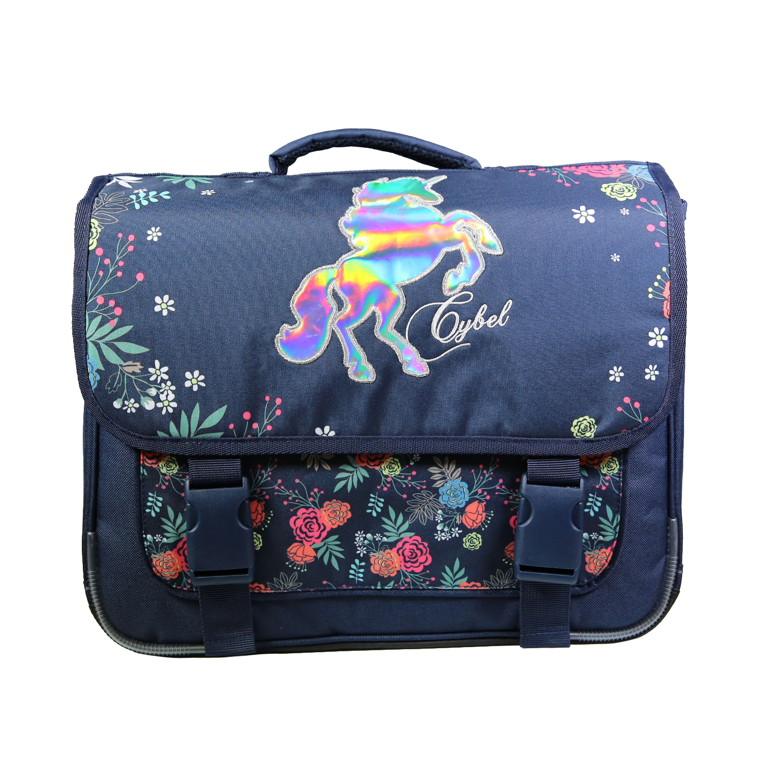 Entrez dans l'univers féérique du cheval licorne Cybel, pour une rentrée prometteuse ! Ce cartable Cybel 38 cm bleu marine conviendra parfaitement aux enfants de primaire. Confectionné en polyester, sa matière qualitative assure durabilité. Le fond du produit est également renforcé. Il mesure 38 cm de long, 13 cm de large et 34 cm de haut, pour un poids de 650 grammes. Très pratique, il dispose de deux compartiments ainsi que d'une poche avant sous rabat. Le bien-être de votre enfany est notre priorité, c'est pourquoi ce produit dispose d'un dos et de bretelles matelassées. Les bretelles sont également équipées de bandes réfléchissantes afin de garantir une sécurité maximale à votre petit bout sur le chemin de l'école. Le dos est réalisé en matière respirante pour un confort au top du top tout au long de sa journée.Le cheval licorne Cybel holographique est l'élément incontournable de ce cartable ! Horné de fleurs multicolores sur un fond bleu marine, votre enfant ne le quittera plus. Ce produit est garanti 2 ans !