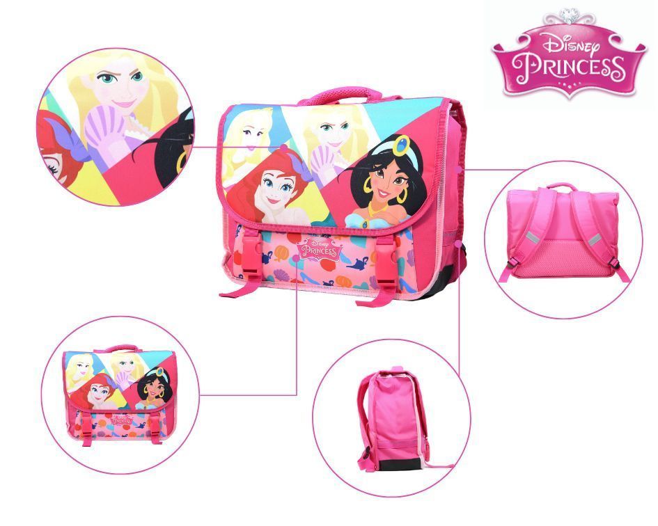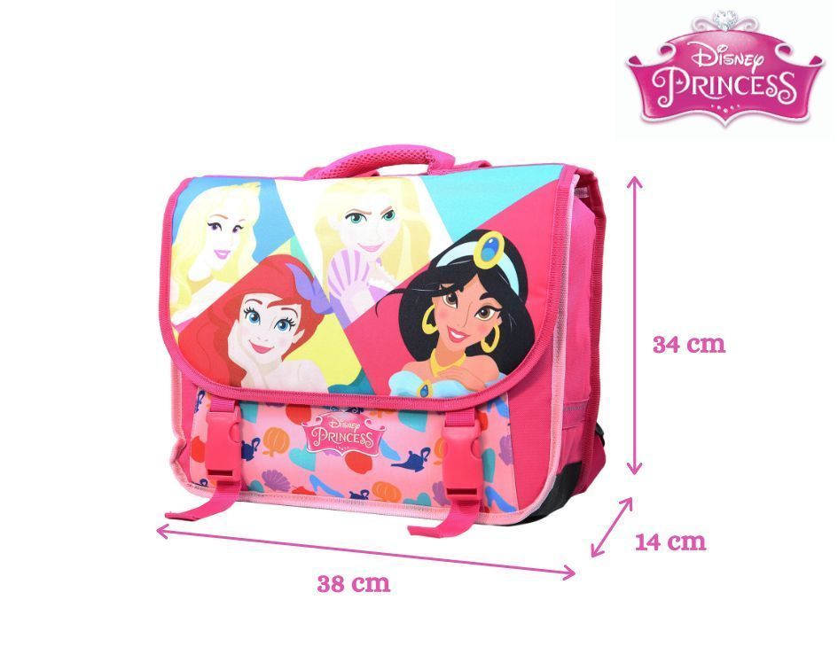Le cartable Princesses 38cm sera parfait pour que votre enfant passe une bonne rentrée des classes et encore mieux, une bonne année scolaire ! La Belle Au Bois Dormant, La Petite Sirène, Raiponce et Jasmine sont prêtes pour une rentrée des classes haute en couleurs ! Ce grand cartable avec ses 2 compartiments et sa poche avant permettra à votre enfant d'y ranger sans problème toutes ses fournitures scolaires. Le tout protégé par un rabat fermé avec deux clips. Ses dimensions de 38cm de long, 14cm de large et 34cm de haut sont adaptées pour les classes de primaire. Coloris rose. 100% polyester. Des bandes réfléchissantes assurent la visibilité de votre enfant sur le chemin de l'école. Nous avons équipé ce cartable d'un dos et de bretelles matelassés ainsi que d'un fond et de coins renforcés. Soyez certain que ce modèle robuste garanti 10 mois ne vous décevra pas.