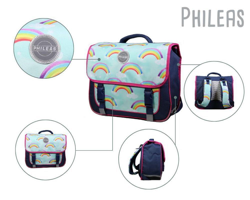 Le cartable Phileas 38cm est très innovant grâce à son système "Smart Comfort" qui le rend si unique. Son design ergonomique est inspiré des sacs de randonnée pour en faire le PLUS CONFORTABLE DES CARTABLES ! Ce design arc en ciel vous fera voyager au pays des rêves ! Ce grand cartable avec ses 2 compartiments et sa poche avant permettra à votre enfant d'y ranger sans problème toutes ses fournitures scolaires. Le tout protégé par un rabat fermé avec deux clips. Ses dimensions de 38cm de long, 16cm de large et 34cm de haut sont adaptées pour les classes de primaire. Coloris bleu turquoise et rose. 100% polyester. Le dos moulé en mousse "EVA" permet au cartable d'épouser parfaitement le dos de l'enfant en allégeant la pression sur la colonne vertébrale. La mousse haute densité en demi-lune permet de protéger le bas du dos. Les bretelles ergonomiques enveloppent la partie avant des épaules avec une mousse ultra confort. Des sangles de rappel de charge permettent le réglage en hauteur, le tout pour une meilleure répartition du poids sur les épaules et un portage au plus près du dos garantissant une très bonne stabilité. Pour garantir la sécurité de votre enfant, ce cartable est équipé de bandes réfléchissantes. Soyez certain que ce modèle robuste garanti 10 mois ne vous décevra pas.