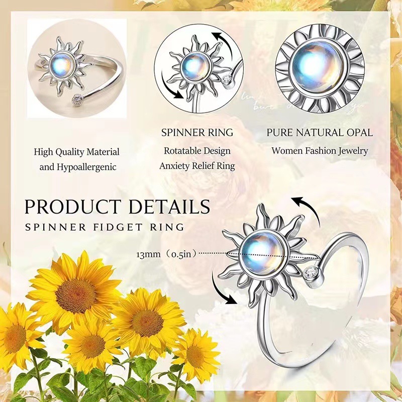 La belle bague avec un joli tournesol peut réduire le stress et l'anxiété. La bague est en cuivre doux pour la peau et ne contient ni plomb ni nickel. Elle possède une surface lisse qui le rend confortable à porter. L'anneau est ouvert donc la taille peut être ajustée.