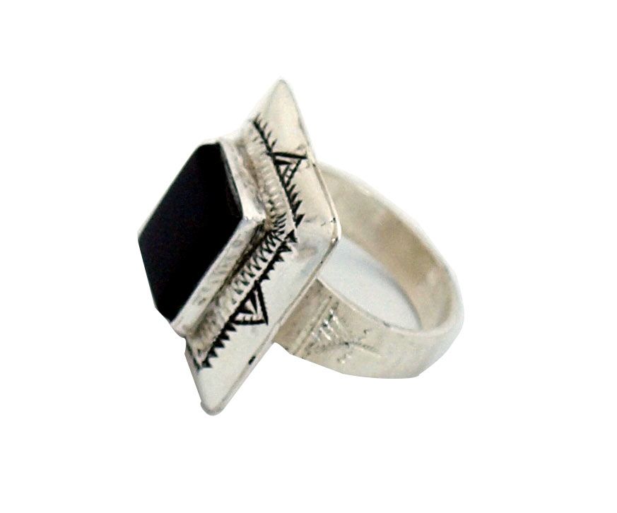 Bague ethnique argent Touareg de forme rectangulaire en argent gravée de motifs traditionnels touareg, montée avec une agate noire de forme carrée. Anneau gravé. Jolie bague chic et moderne à offrir bague ethnique de l'artisanat africain du Niger fabriquée à la main Dimension : 3cm x 2,8cm - Poids : 5gr