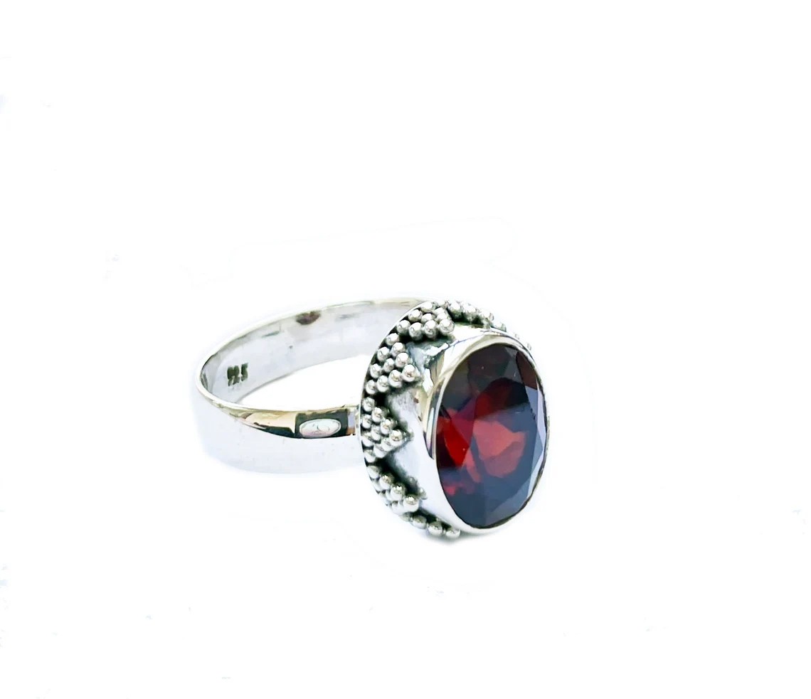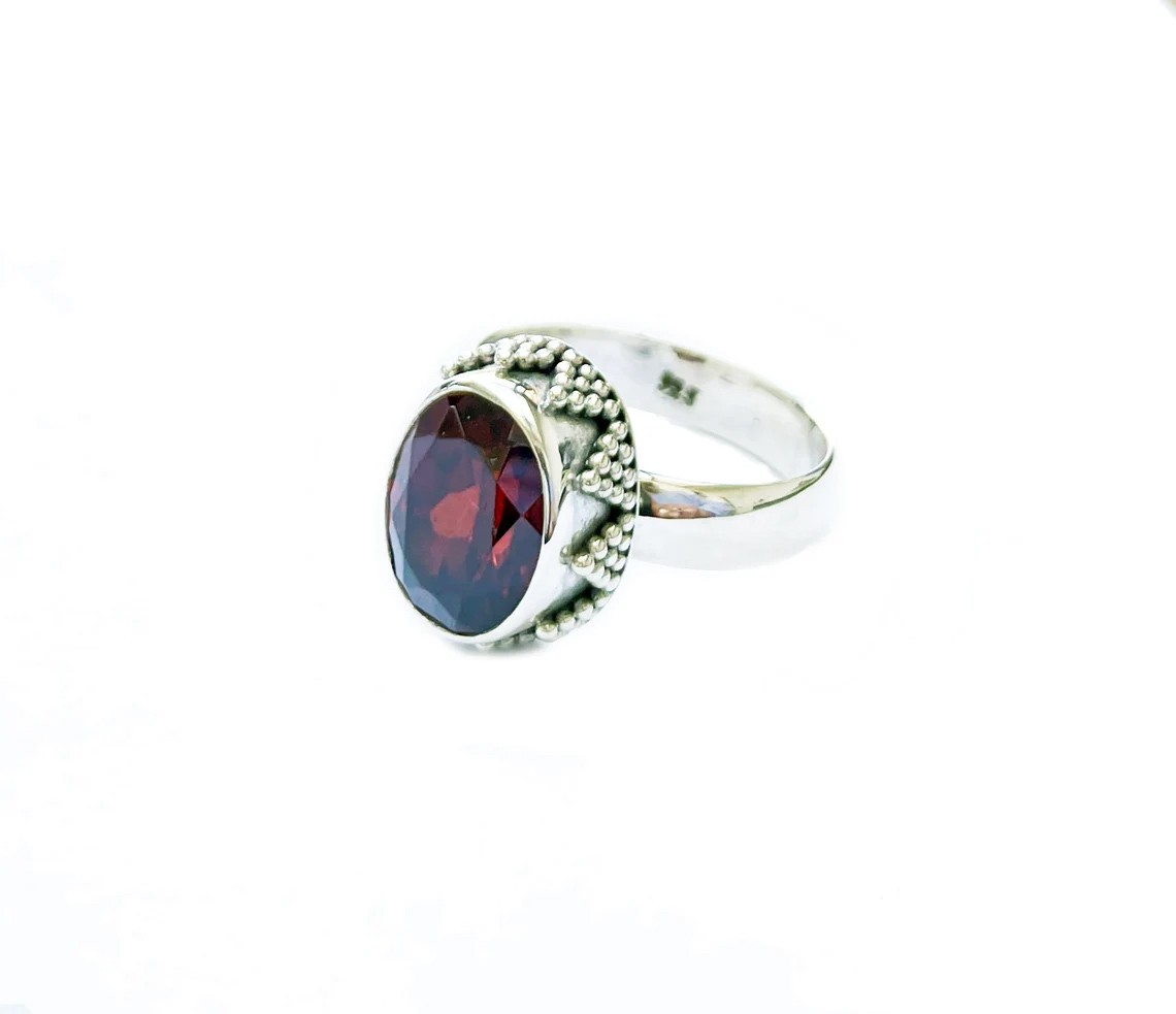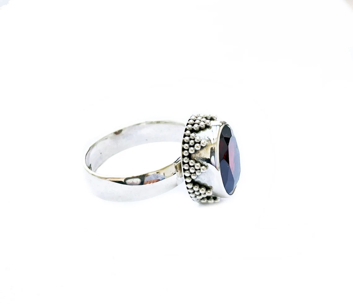 Jolie bague en argent, composée d'un anneau lisse sur lequel est monté une armature en argent parsemé de petites perles d'argent en forme de triangle. L'ensemble est surmonté d'un très beau grenat ovale facetté en diamant Largeur du cabochon et grenat : 1.6cm x1.4cm hauteur du cabochon : gent : 0.7cm - poids 7gr