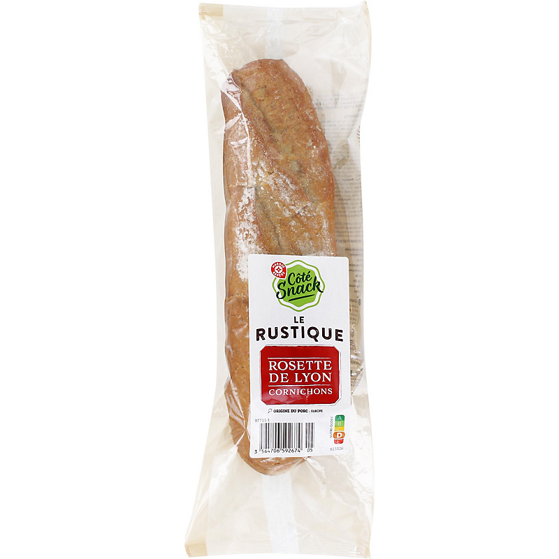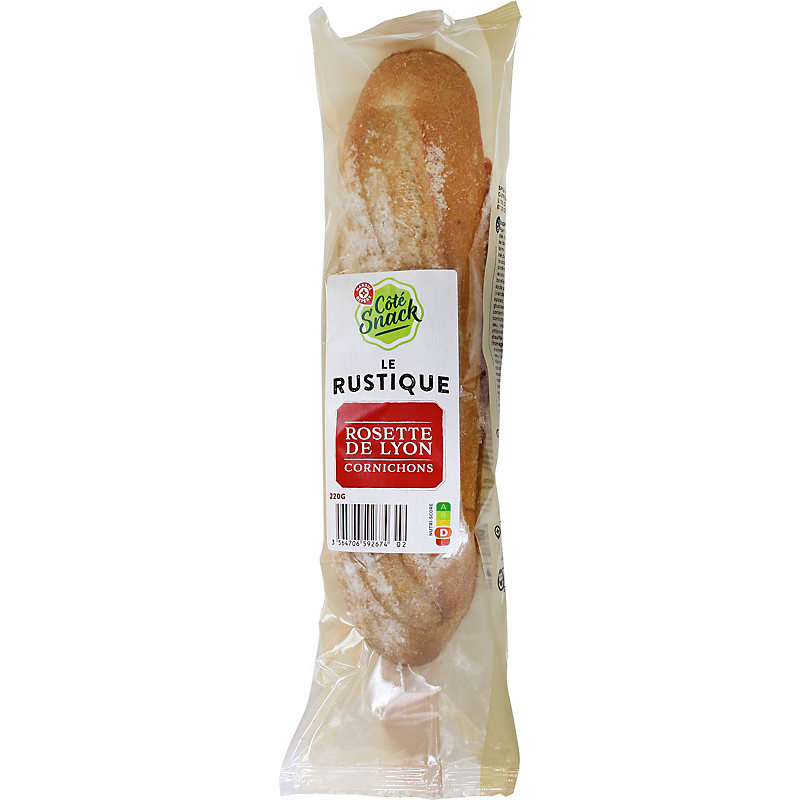 Sandwich au pain spécial de campagne garni de rosette de Lyon, d’une sauce (13,7 %) à base de yaourt et de cornichons au vinaigre COTE SNACK