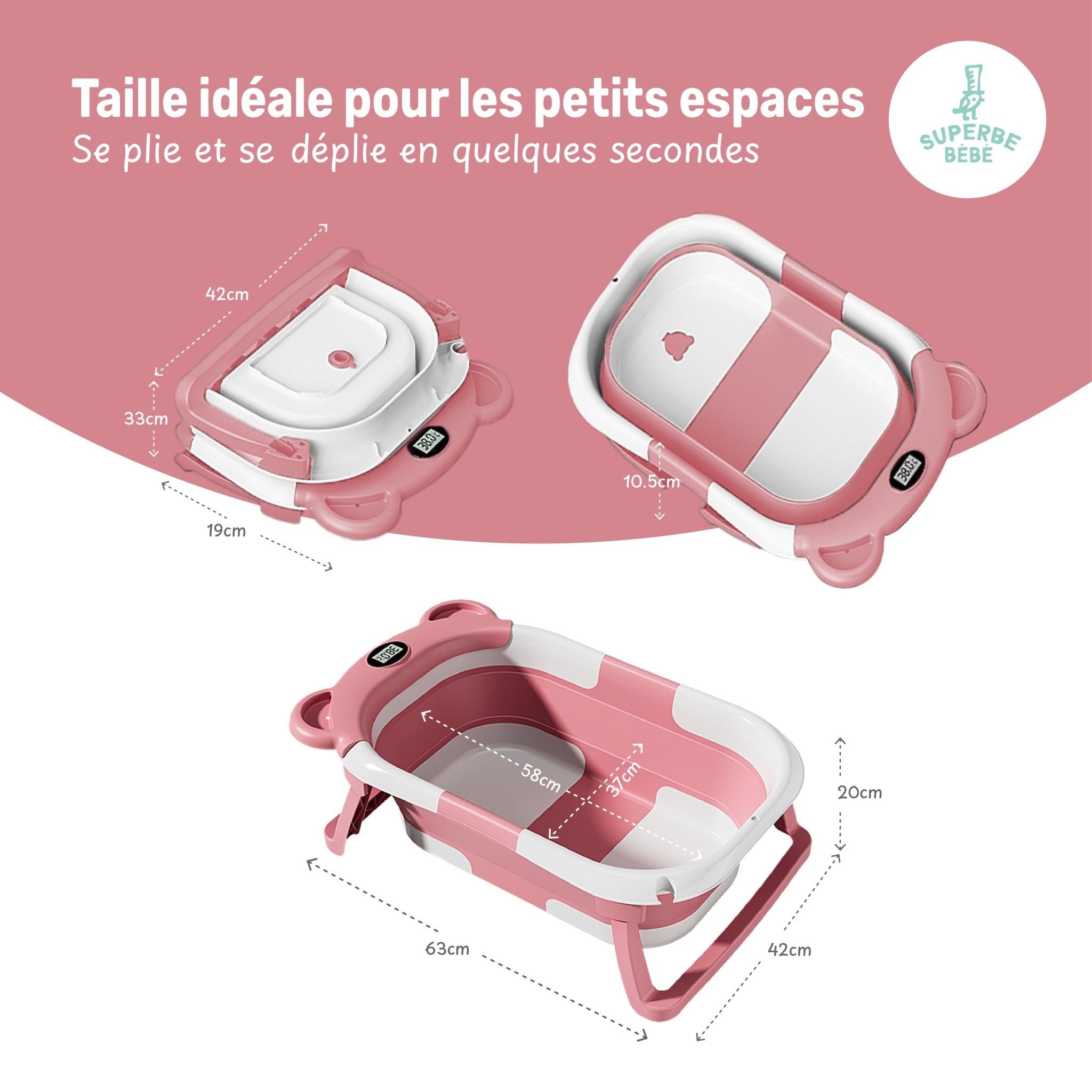 TOUT-EN-UN : Baignoire bébé pliable livré avec coussin de bain et thermomètre digital intégré. CONFORT OPTIMAL : grâce au coussin de bain ergonomique offert, offrant un soutien idéal pour bébé. CONTRÔLE DE LA TEMPÉRATURE : Le thermomètre digital intégré permet de surveiller la température de l'eau en temps réel. PLIABLE ET PRATIQUE : Se plie facilement 2 fois pour un rangement pratique et un transport facile. Notre modèle BEAR ultra compact est idéal pour les petits espaces.
