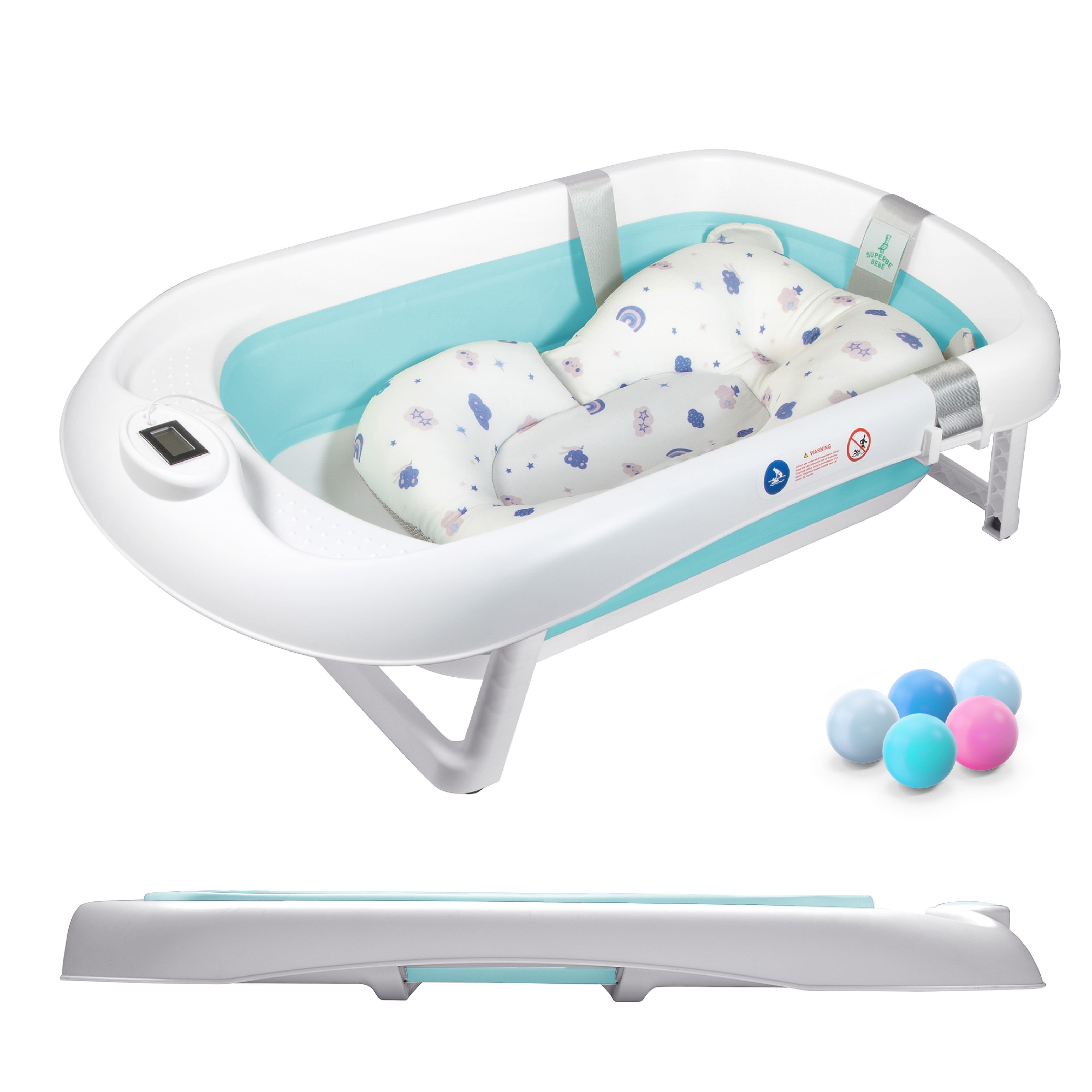 🛁 BAIGNOIRE : Adaptée de la naissance à 3 ans. Livrée avec 5 balles colorées en plastique pour que le bain soit une partie de jeu.