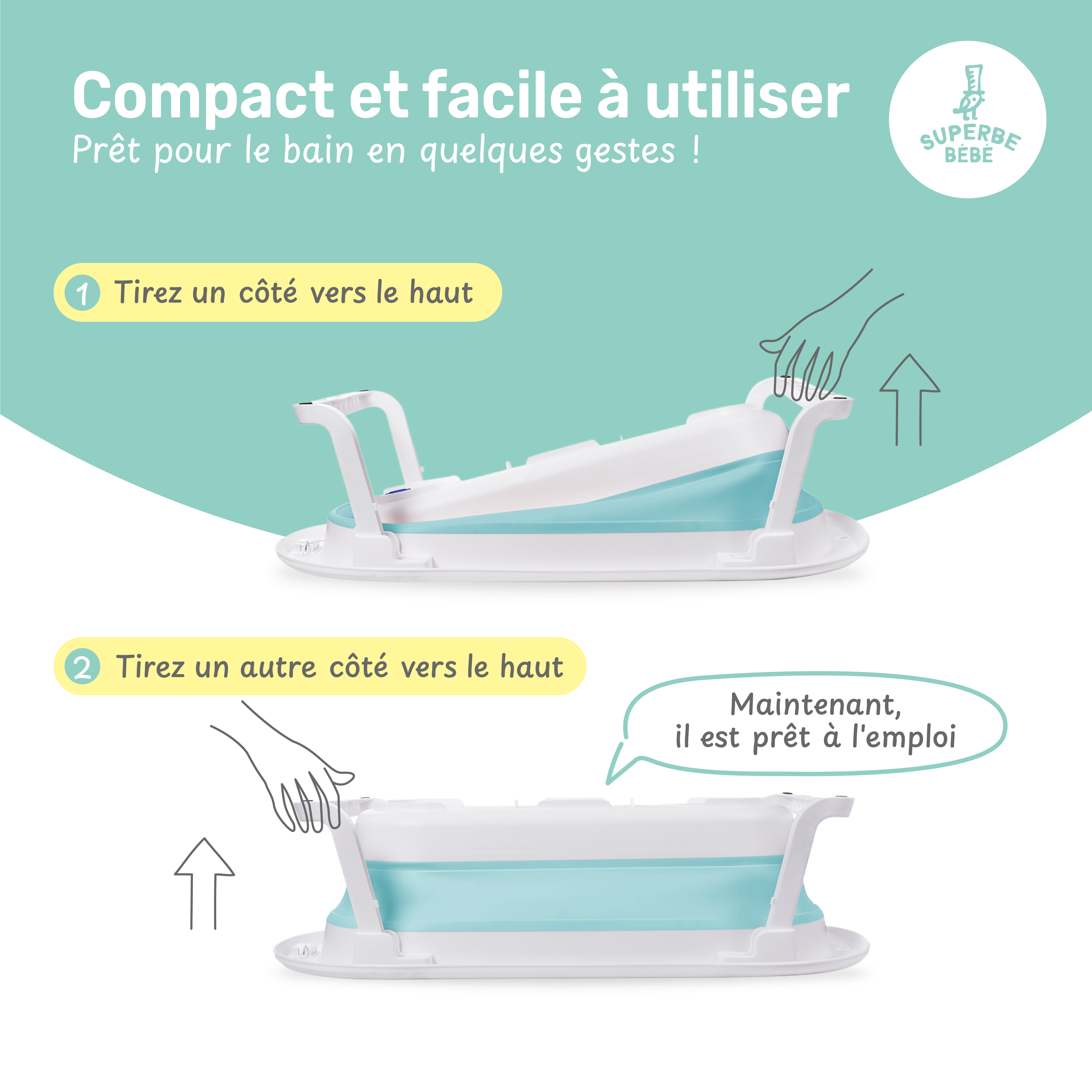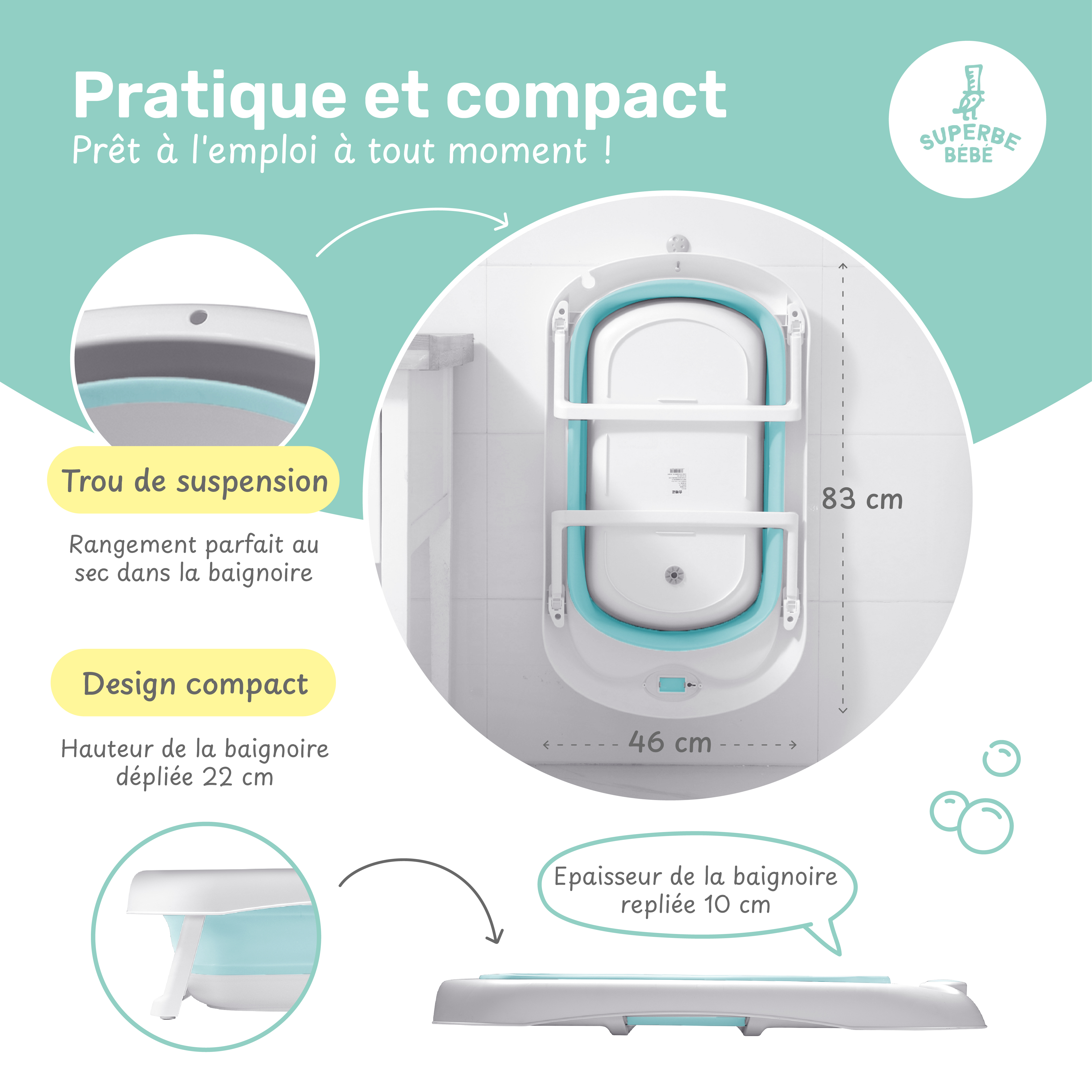💼 RANGEMENT FACILE : La baignoire se plie en 3 secondes et se range facilement grâce à son crochet de rangement.