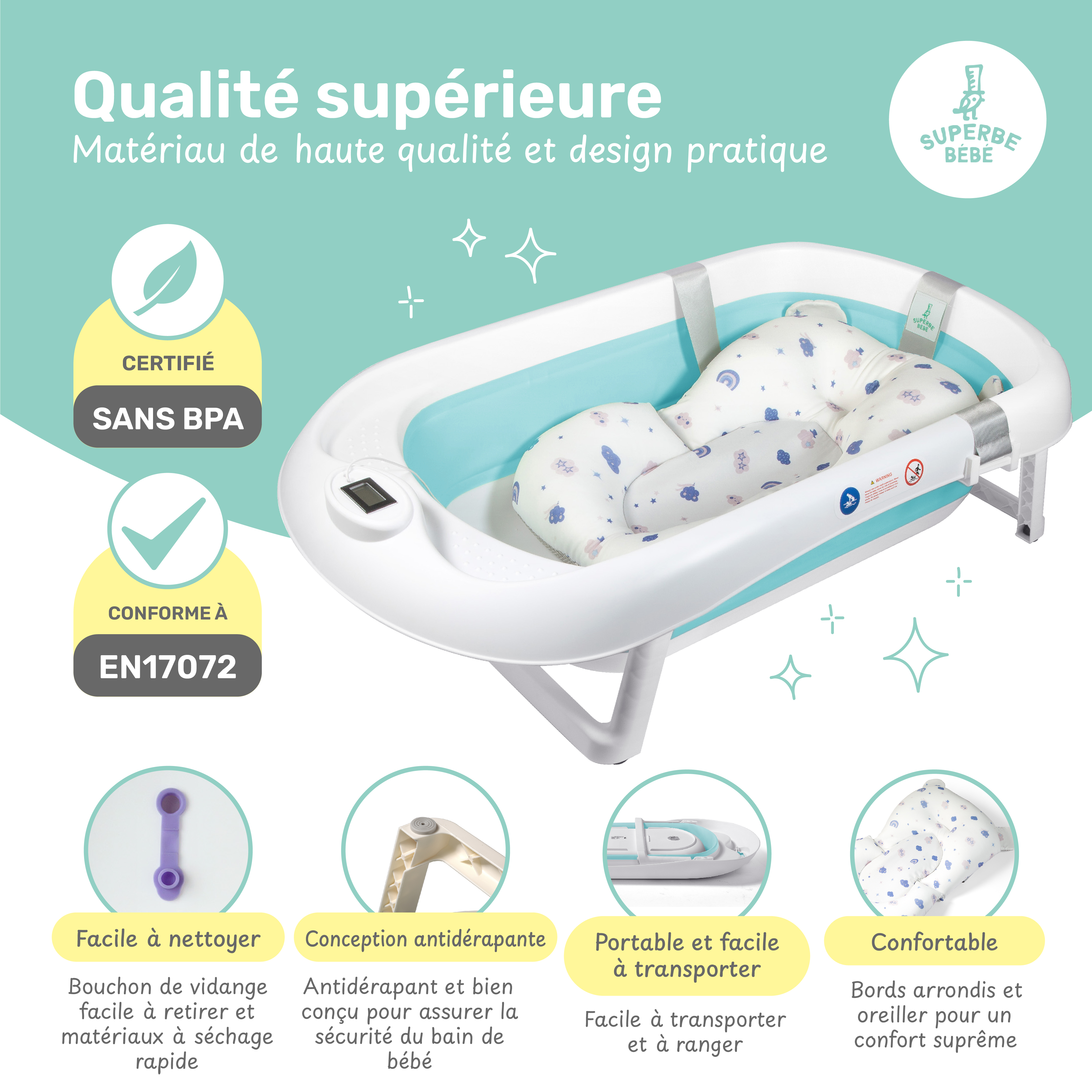 | Libellé | Baignoire bébé pliable - Thermomètre et coussin inclus - BLUE ISLANDE |