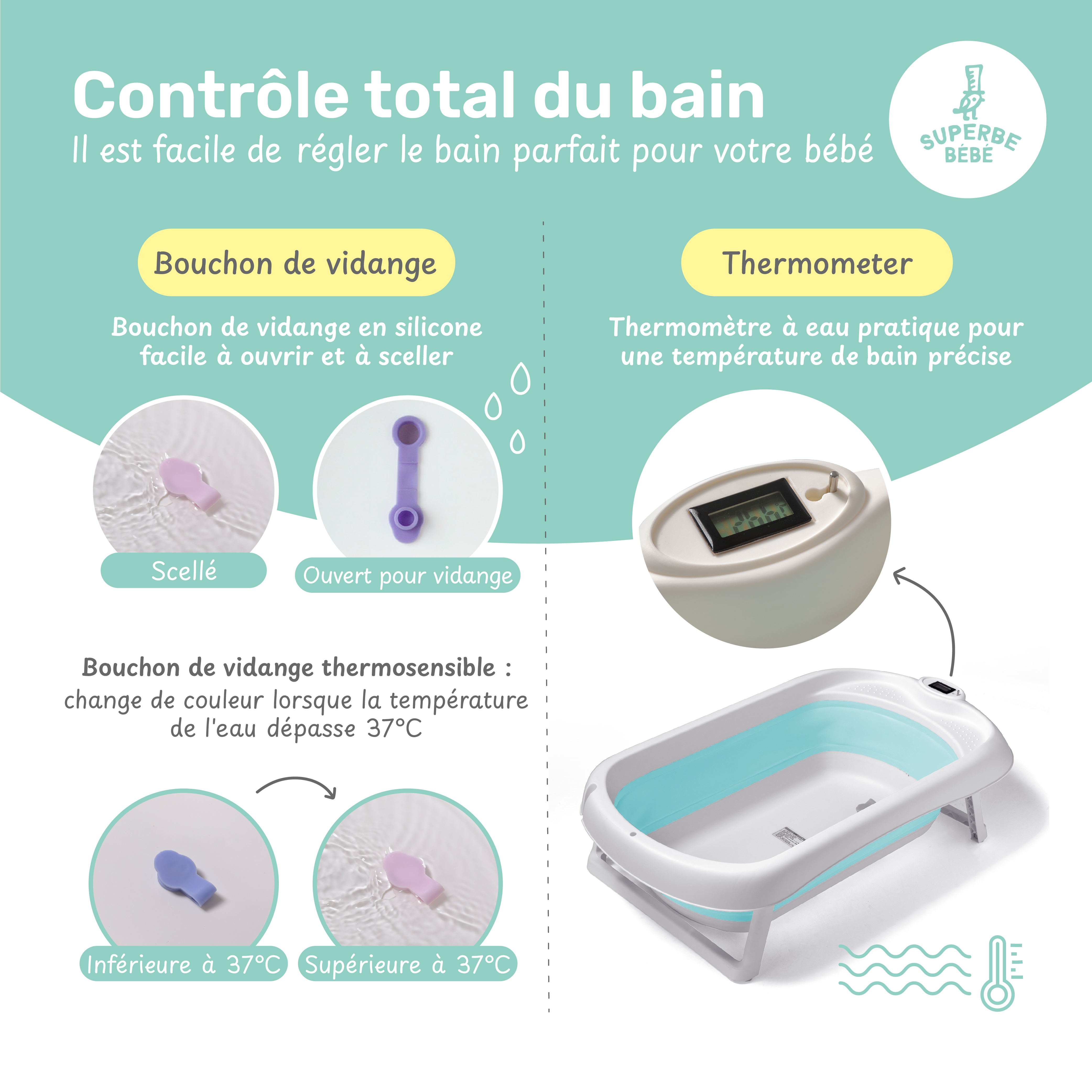 🌡️ SURVEILLEZ LA TEMPERATURE DU BAIN : Grace à son thermomètre digital, vous pouvez facilement surveiller la température de l'eau.