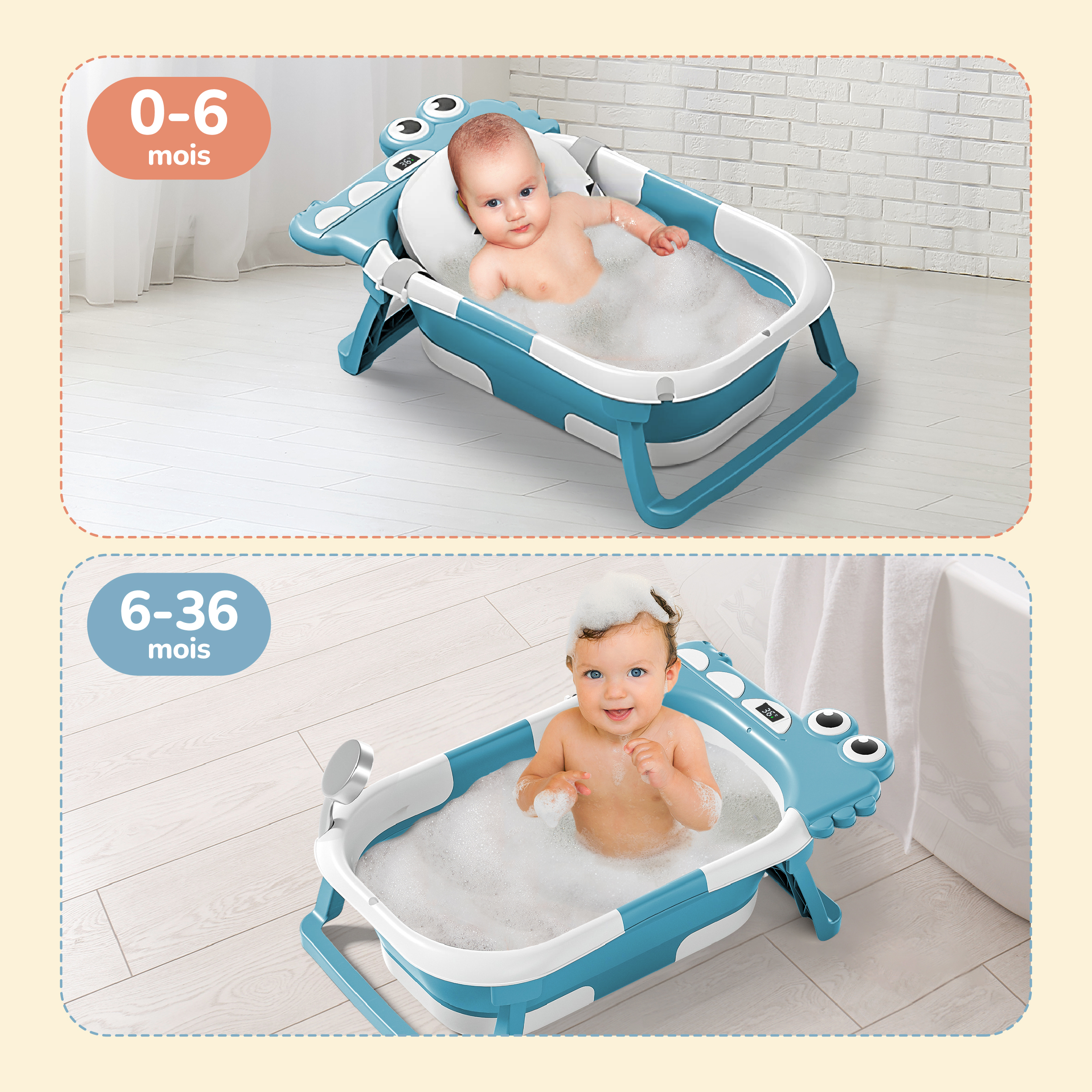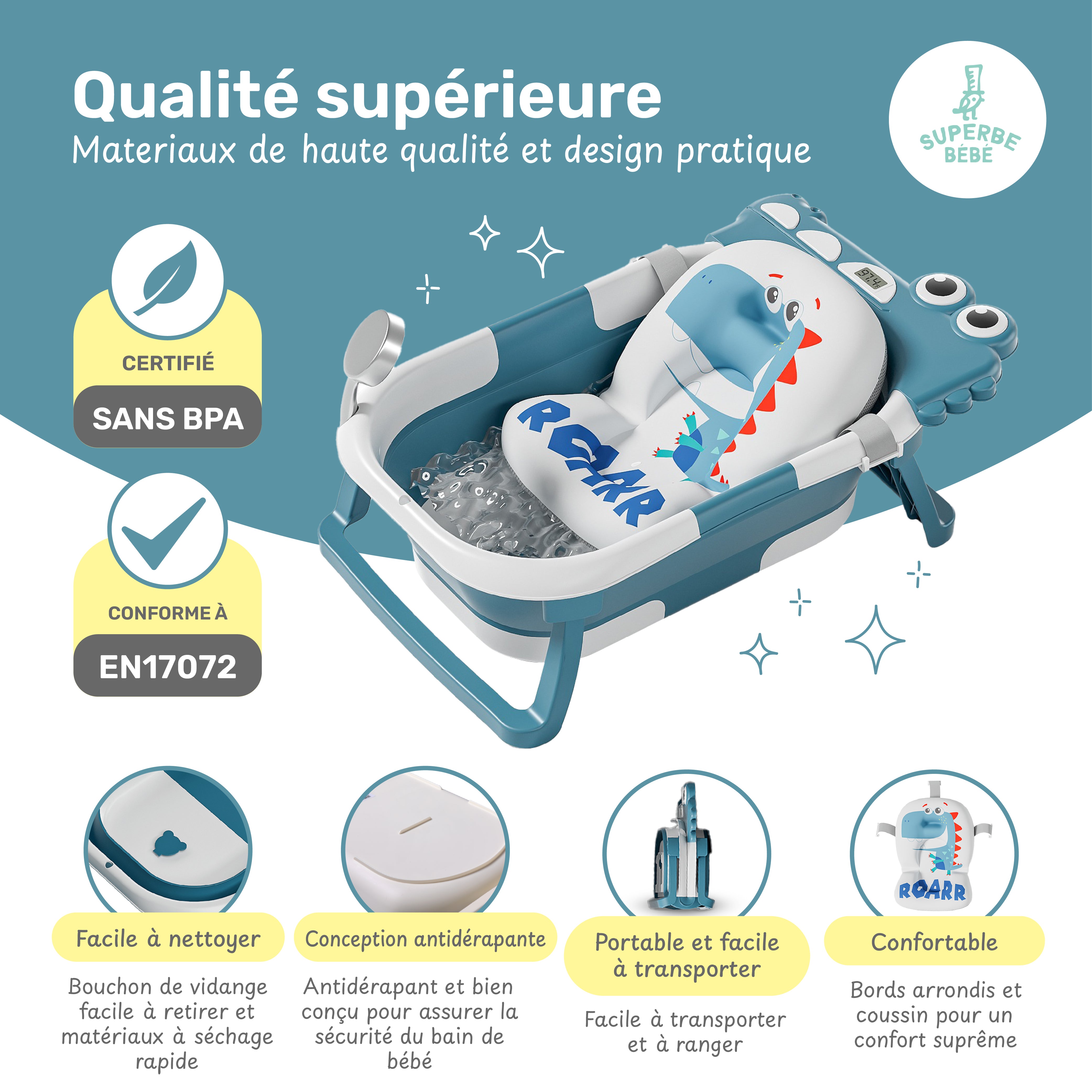 🛁 TOUT-EN-UN : Baignoire bébé pliable livrée avec coussin de bain et thermomètre digital intégré. 🐣 CONFORT OPTIMAL: grâce au coussin de bain ergonomique offert, offrant un soutien idéal pour bébé. 🧼 CONTRÔLE DE LA TEMPÉRATURE : Le thermomètre digital intégré permet de surveiller la température de l'eau en temps réel. 💼 PLIABLE ET PRATIQUE : Se plie facilement 2 fois pour un rangement pratique et un transport facile. Notre modèle DINO ultra compact est idéal pour les petits espaces. 🌡️ LA SÉCURITÉ AVANT TOUT : Pieds antidérapants, bord arrondi. Baignoire conforme à la norme EN 17072:2018.
