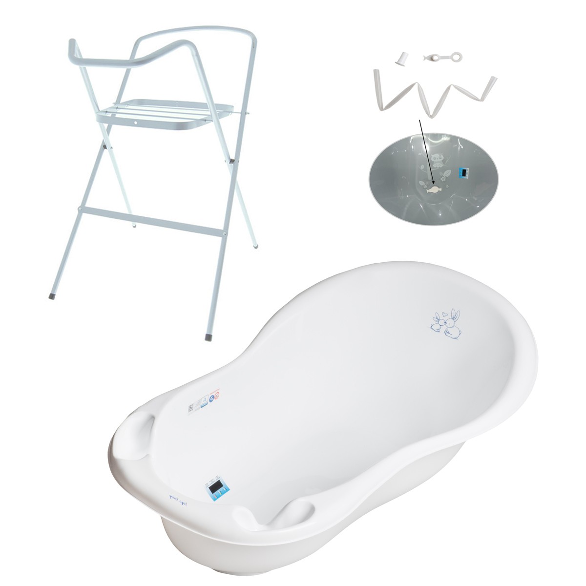 Libellé Baignoire bébé thermomètre Blanc Lapin 86 cm + Pied + Tuyau